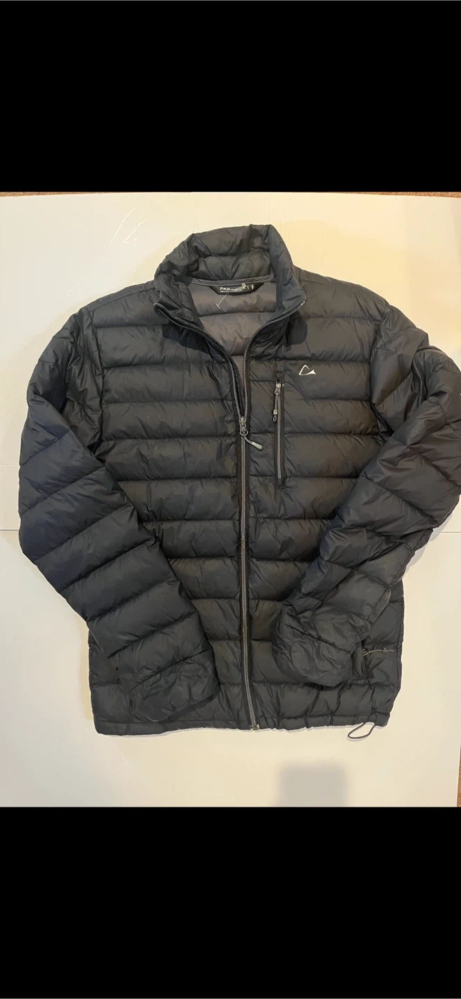 Black Paradox down puffer jacket. It's lightweight and warm. Includes a full zip closure and zippered pockets. Great for staying cozy outdoors!