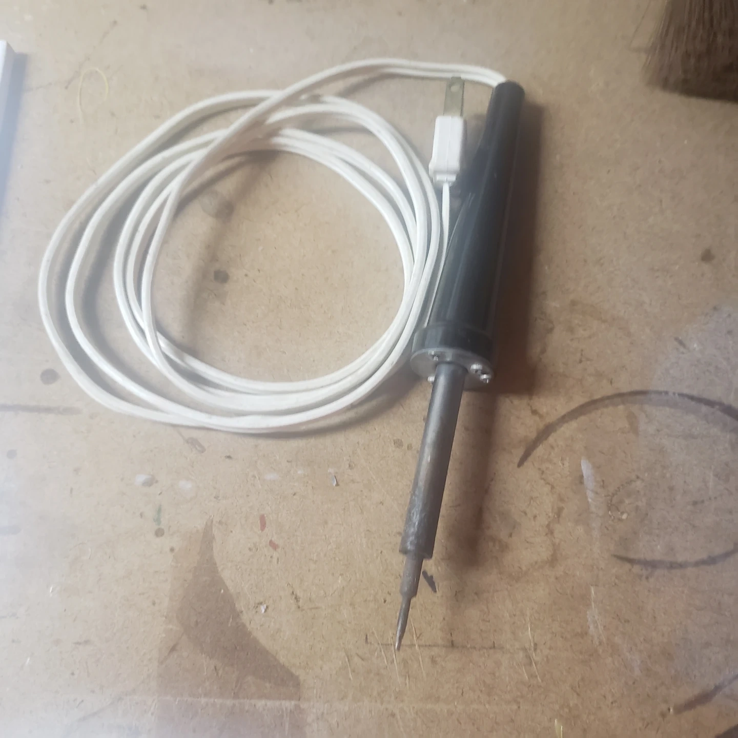 Black handled soldering iron with a white cord. It's suitable for electronics repair and hobbyist projects. The tip is pointed and ready for use. Comes with some solder