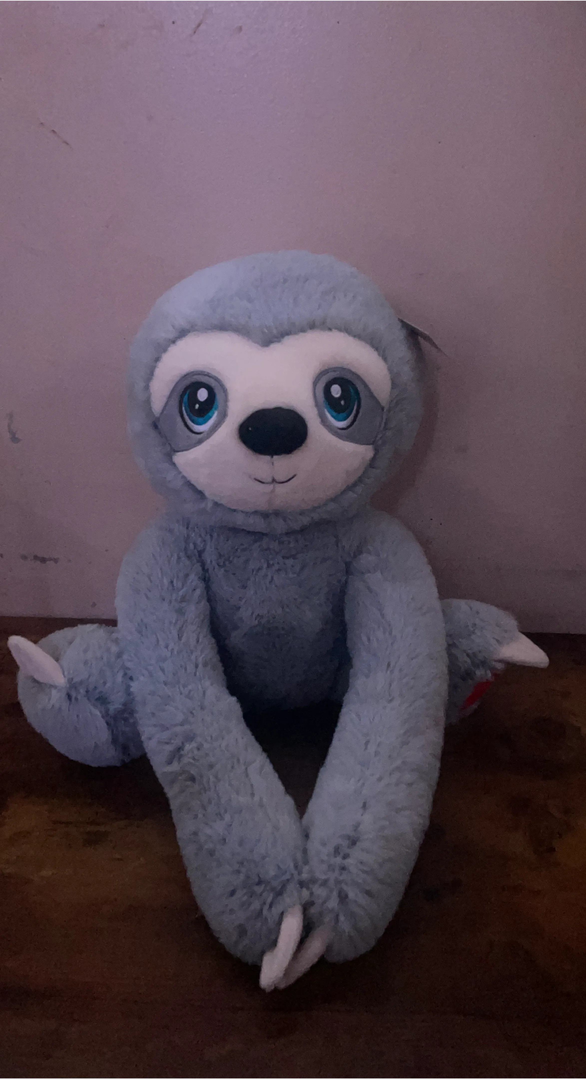 Soft and cuddly blue plush sloth stuffed animal. It has big blue eyes and detailed facial features. Perfect for collectors or as a comforting friend!