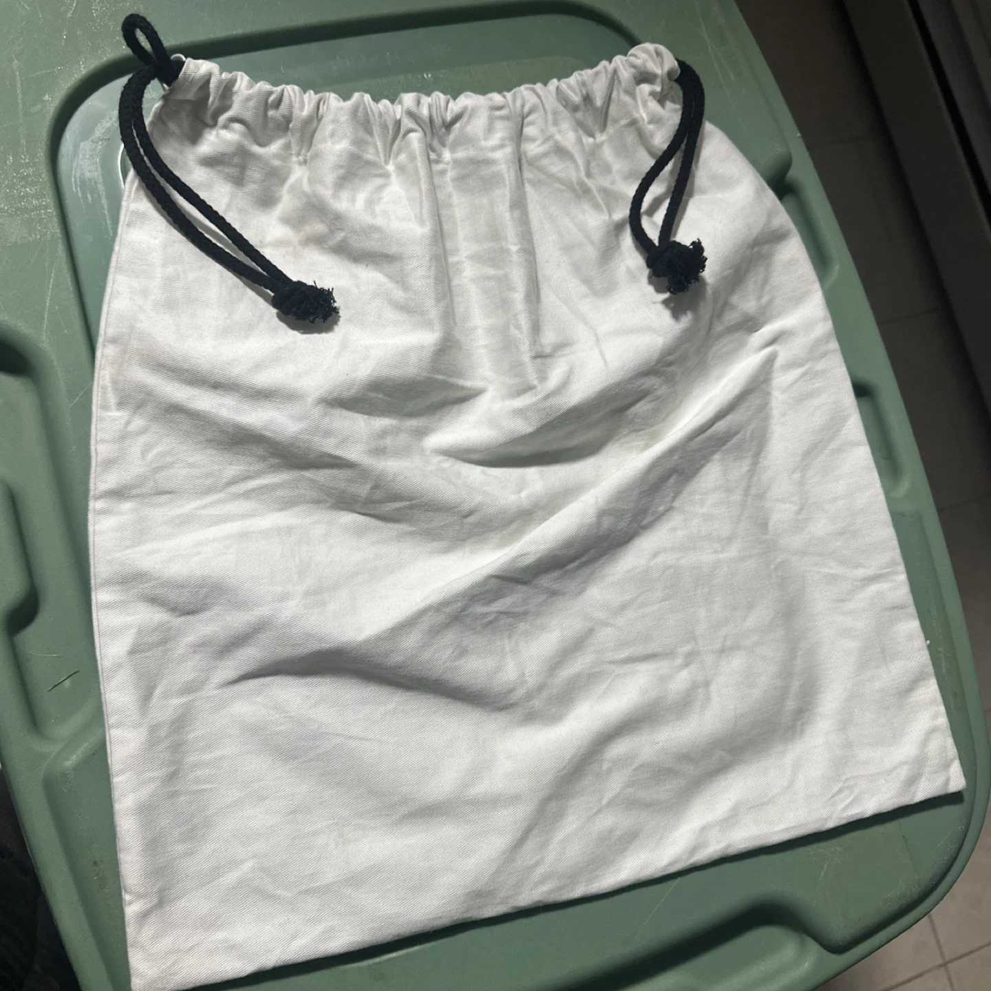 This is an Adidas drawstring bag featuring the Adidas logo and a Bad Bunny graphic. It's made of white cotton with black drawstrings. This bag is perfect for storing shoes or other small items.