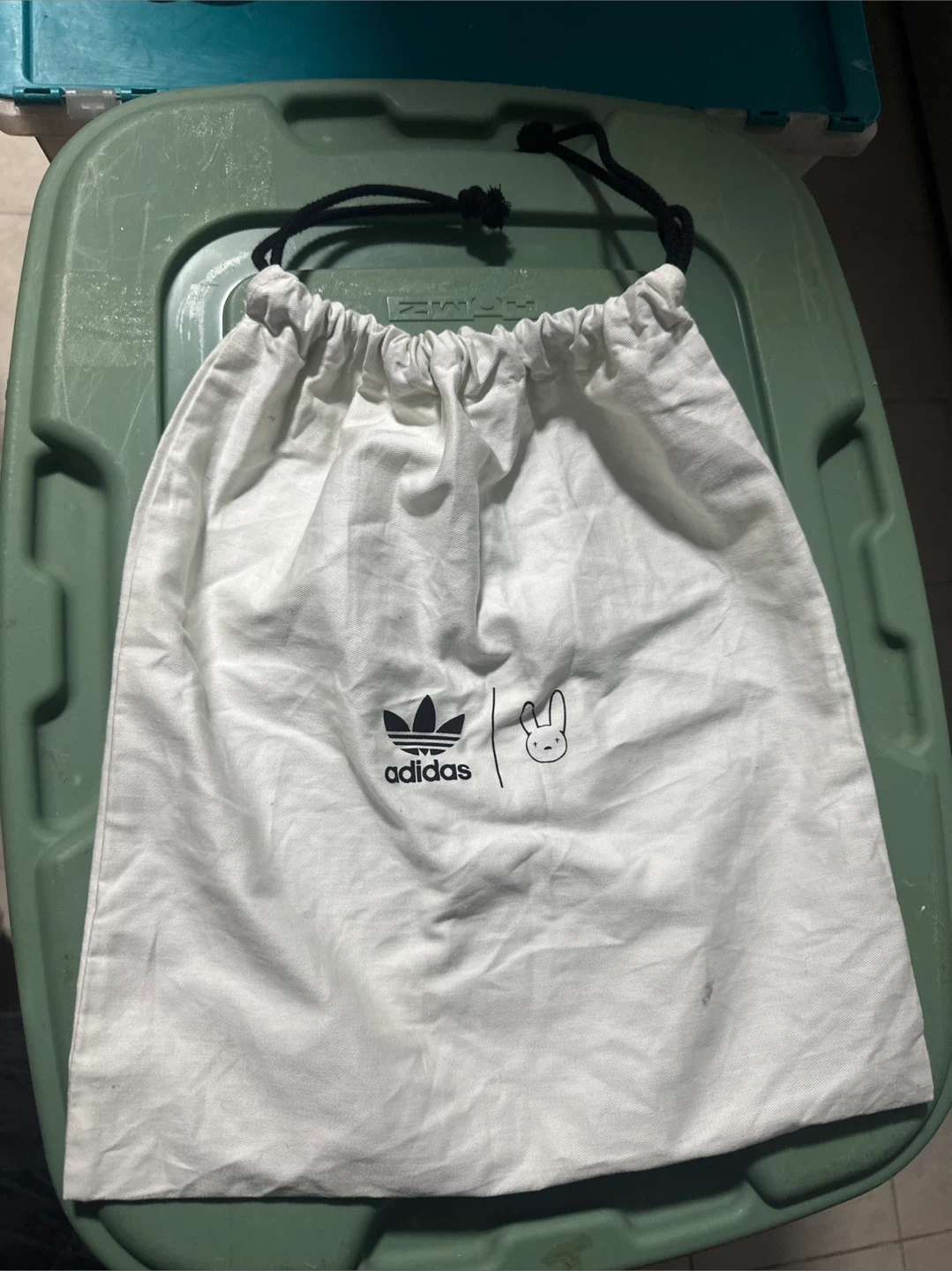 This is an Adidas drawstring bag featuring the Adidas logo and a Bad Bunny graphic. It's made of white cotton with black drawstrings. This bag is perfect for storing shoes or other small items.