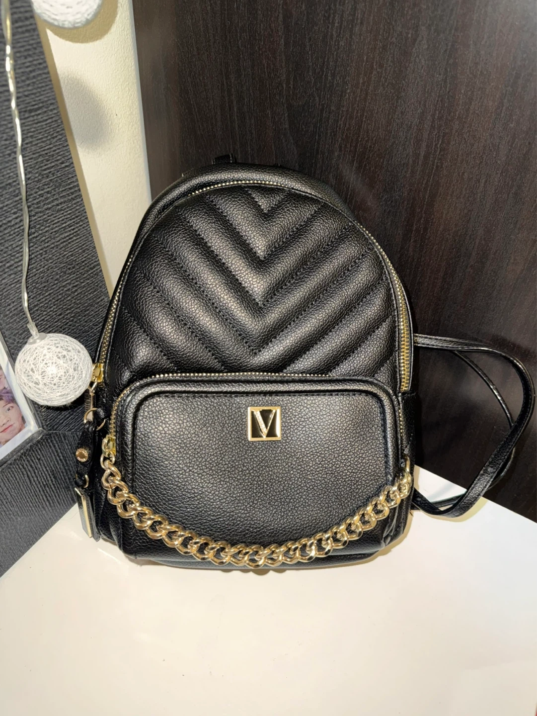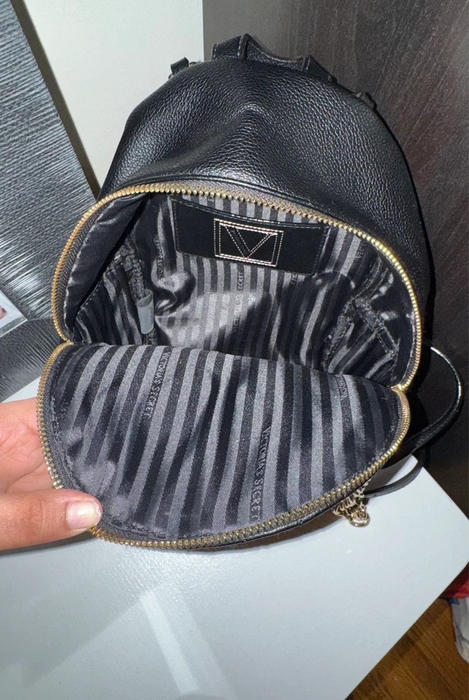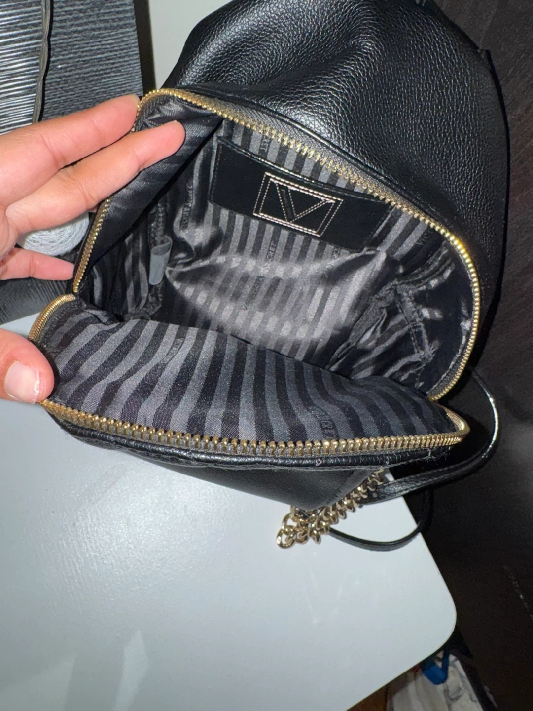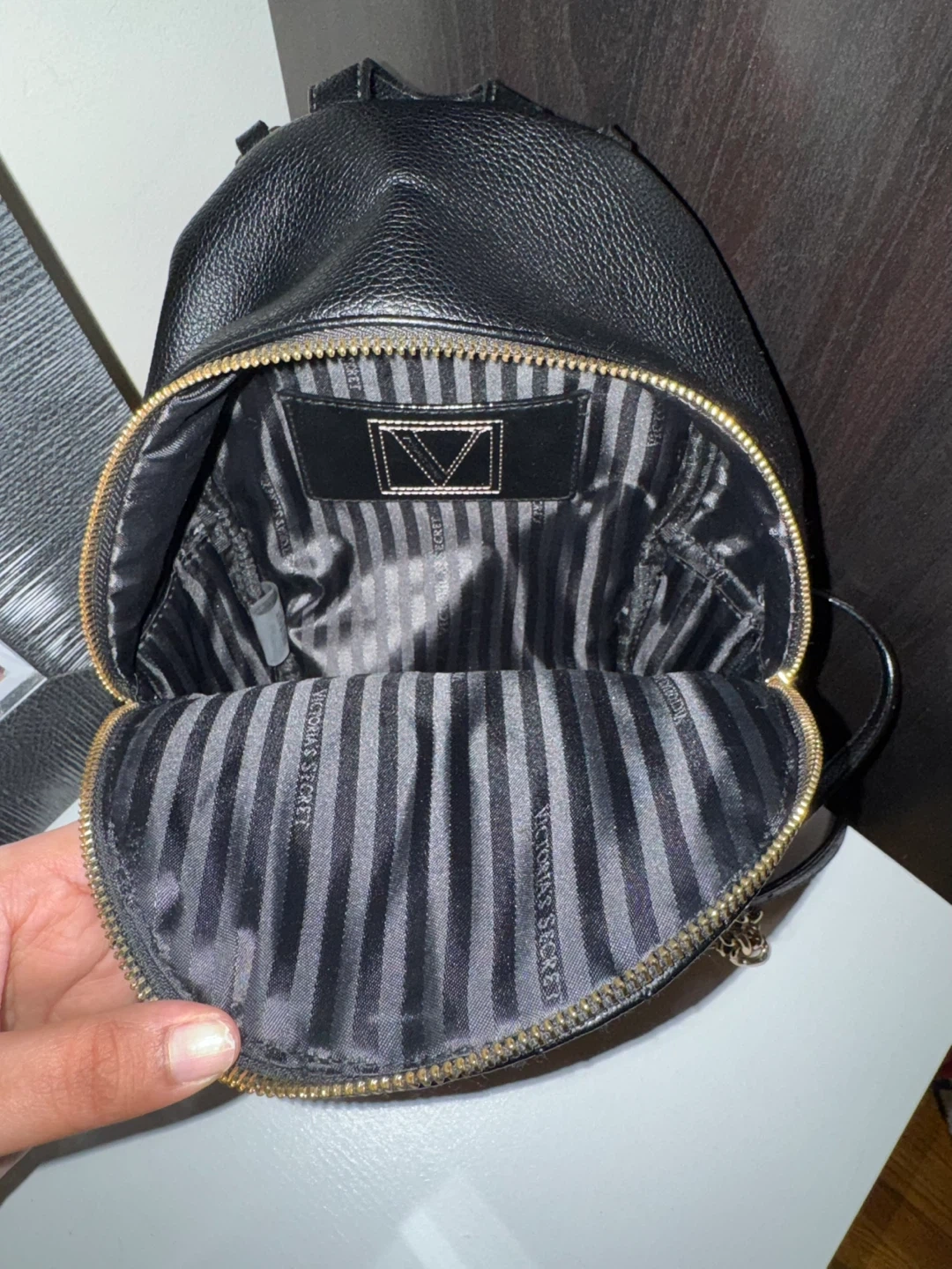 Black quilted faux leather mini backpack from Victoria's Secret. Features gold hardware and a striped lining. It has a main compartment and a front zip pocket.
