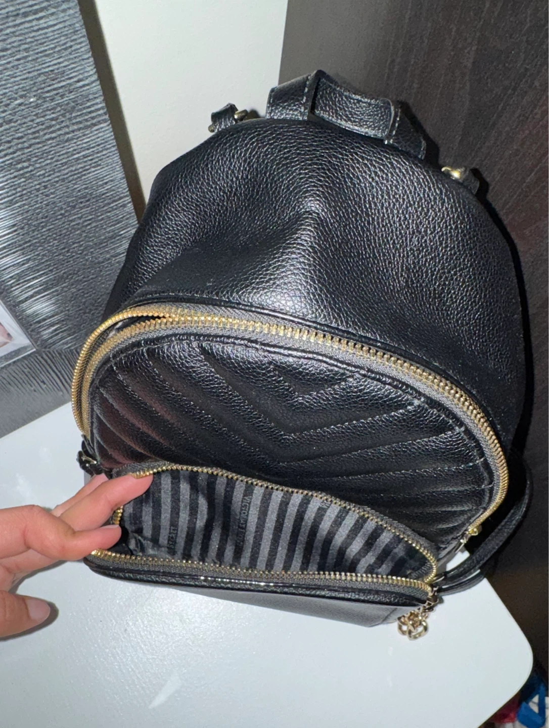 Black quilted faux leather mini backpack from Victoria's Secret. Features gold hardware and a striped lining. It has a main compartment and a front zip pocket.