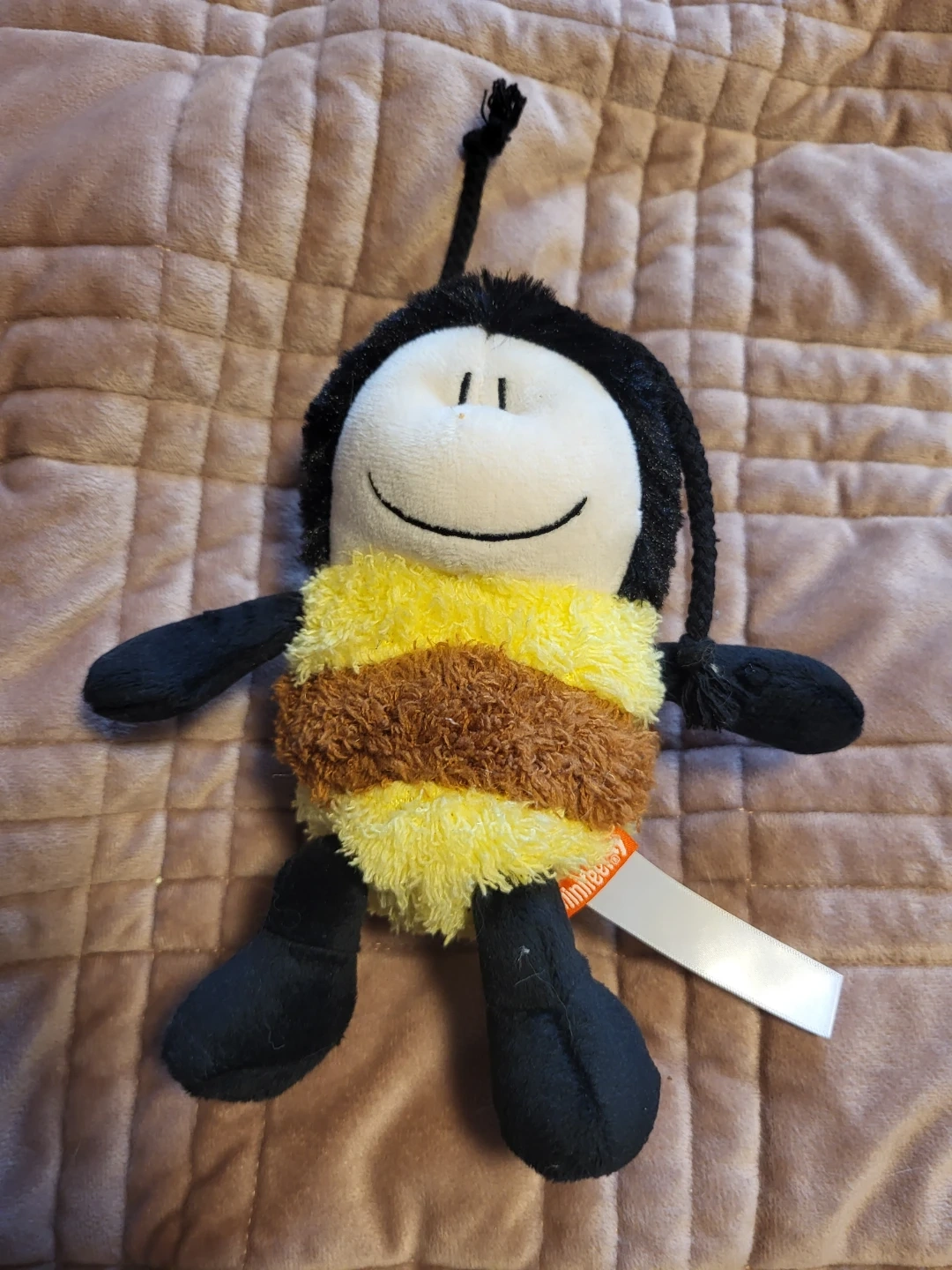 This is a cute plush bee toy with yellow and brown fuzzy stripes. It has black arms, legs, and hair with two braided pigtails. It's a soft stuffed animal perfect for cuddling.