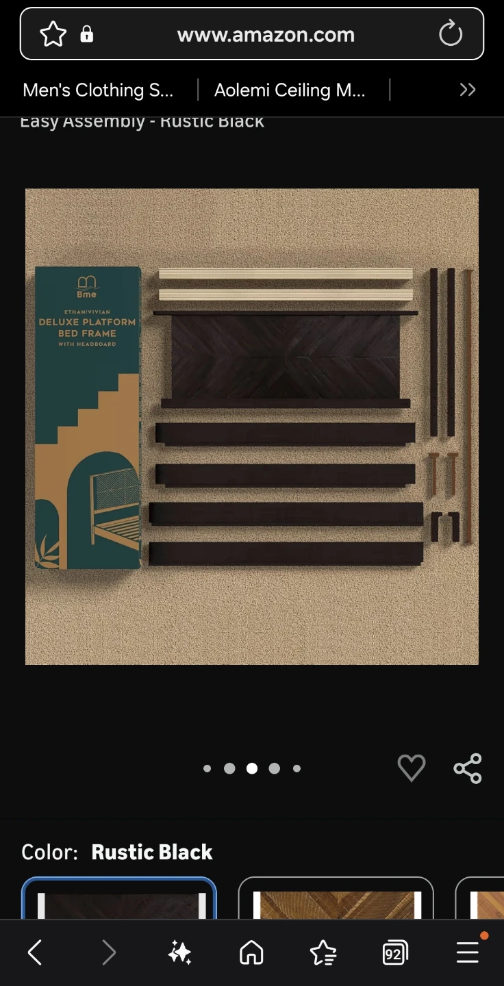 Vivian Bed Frame in Queen size with a rustic black finish. It's made of solid acacia wood and includes 12 strong wood slats for support. No box spring is needed for this platform bed frame!