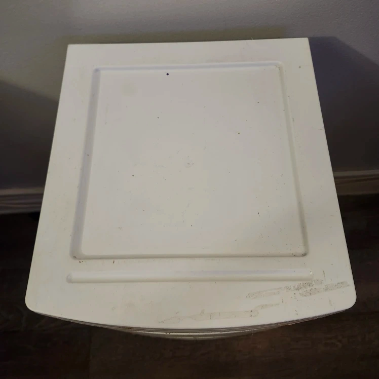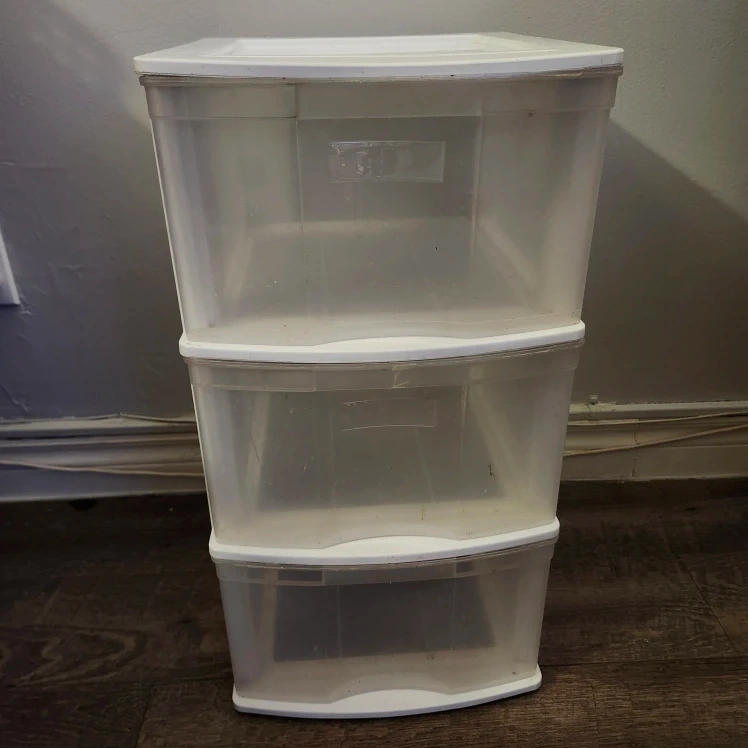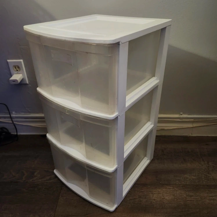 Sterilite 3-drawer wide weave tower in white. It's perfect for organizing your space and keeping things tidy. It has some signs of use, but it's still in good condition and ready to help you get organized!