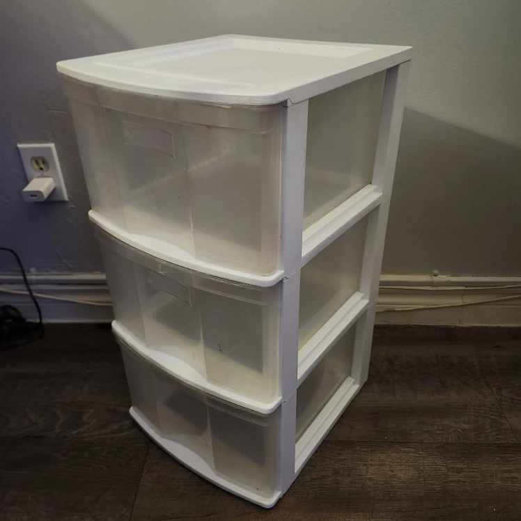 Sterilite 3-drawer wide weave tower in white. It's perfect for organizing your space and keeping things tidy. It has some signs of use, but it's still in good condition and ready to help you get organized!