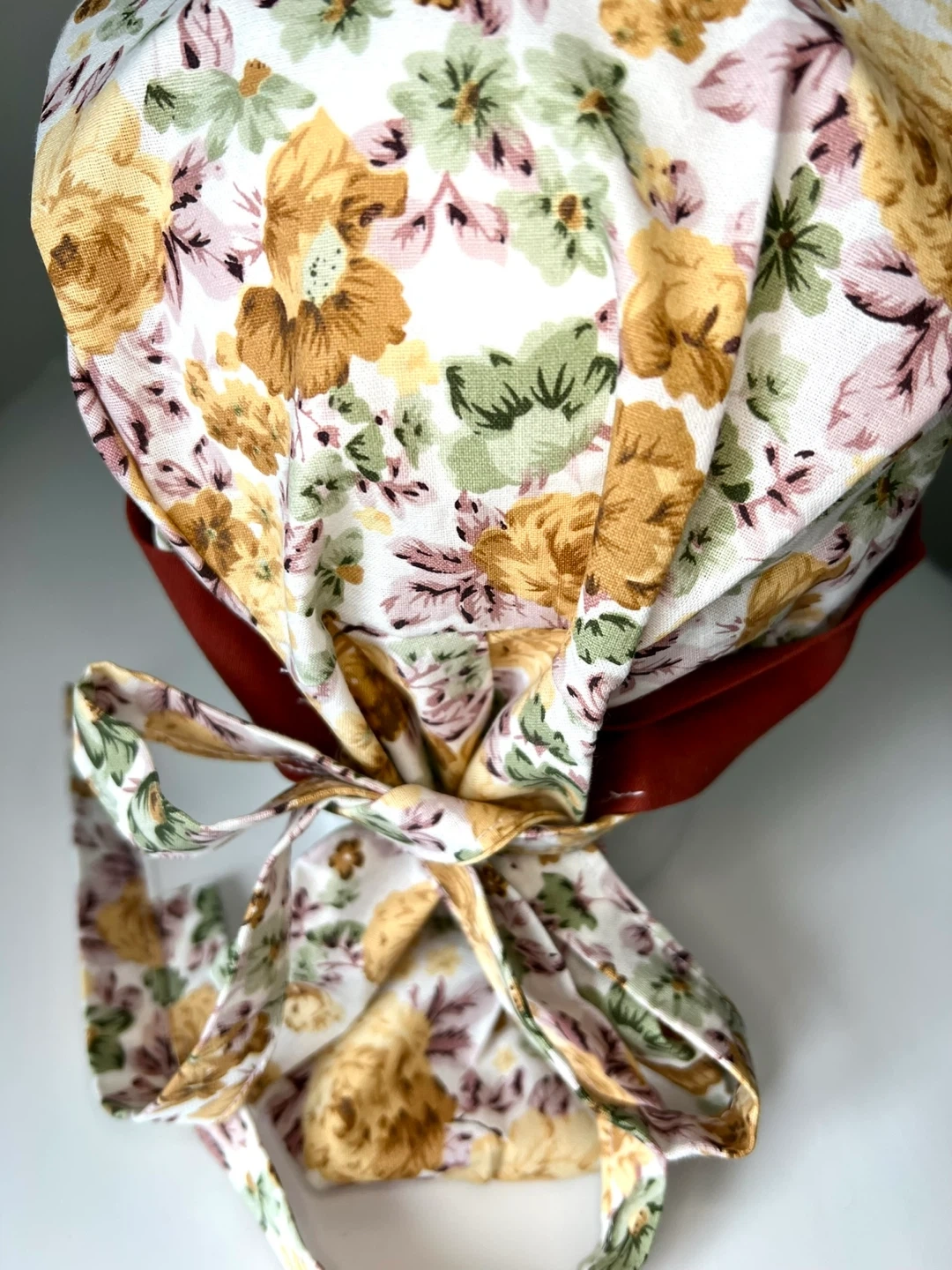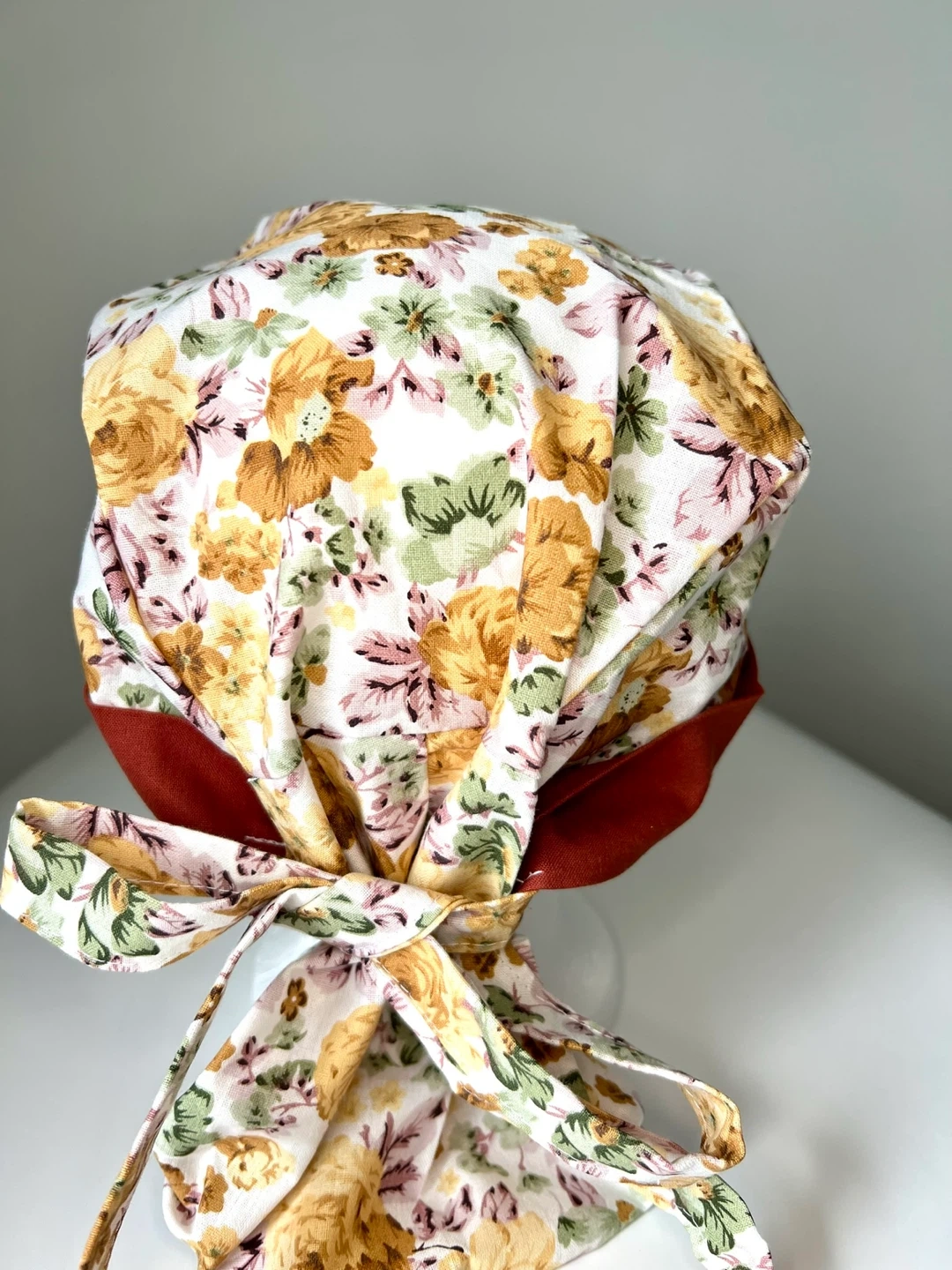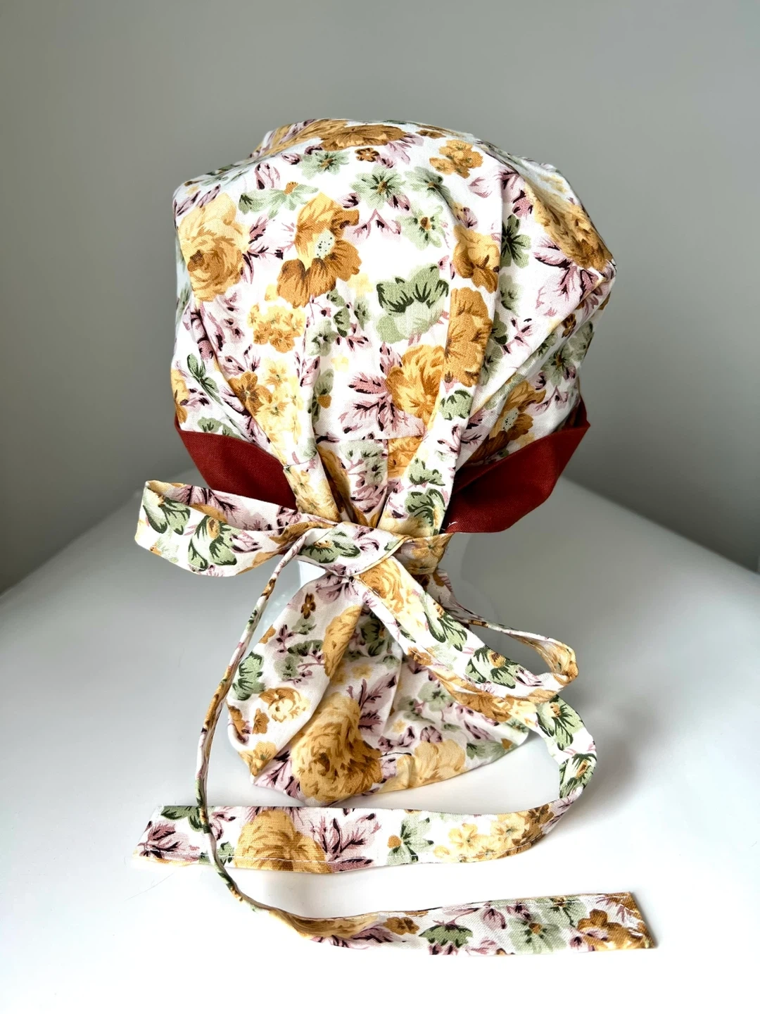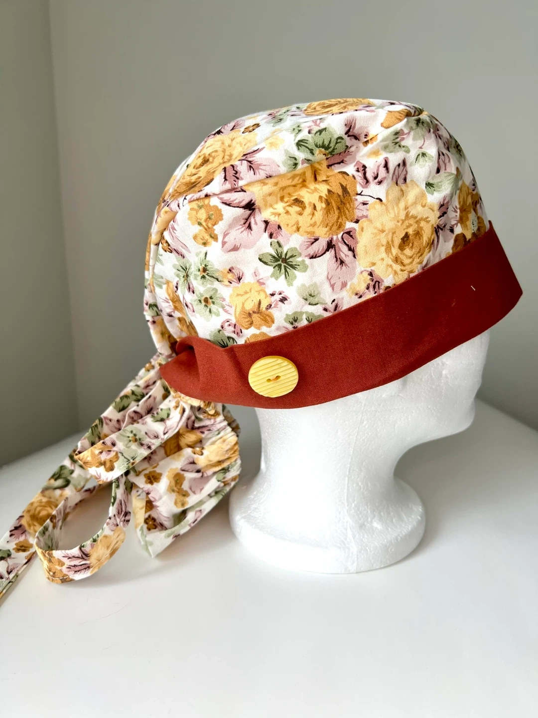 Handmade This is a scrub cap with a floral pattern and a burnt orange band. It features buttons on the side, which are handy for hanging masks. Ties at the back for an adjustable fit. Made from comfortable cotton fabric.