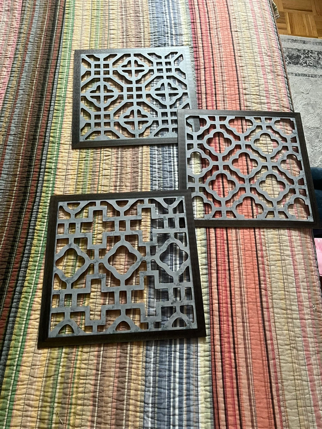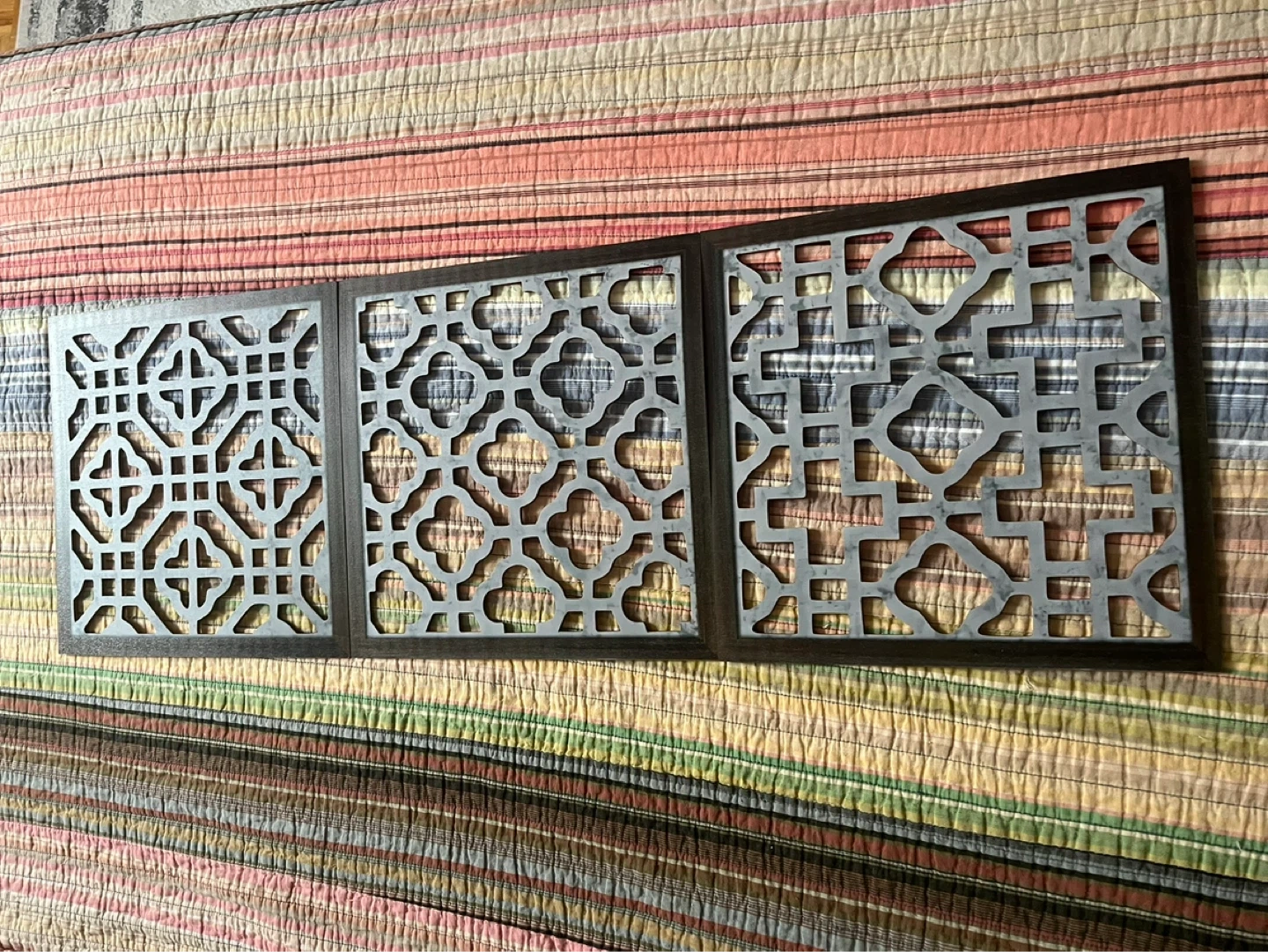 Set of three decorative wall panels featuring a geometric fretwork design. Each panel has a dark wood frame and a grey-toned insert. They're suitable for adding a decorative touch to any room.