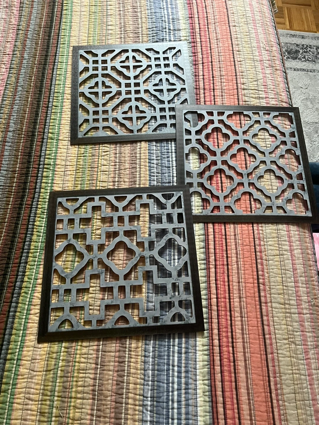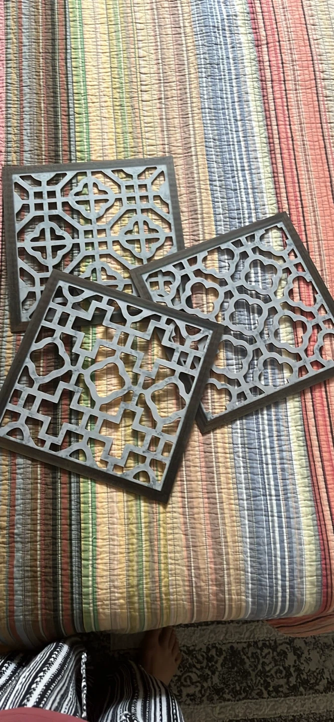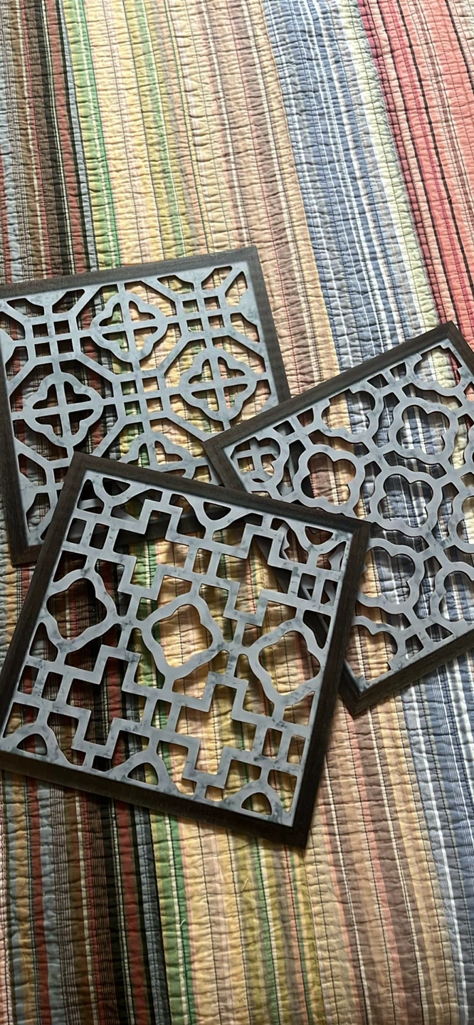 Set of three decorative wall panels featuring a geometric fretwork design. Each panel has a dark wood frame and a grey-toned insert. They're suitable for adding a decorative touch to any room.
