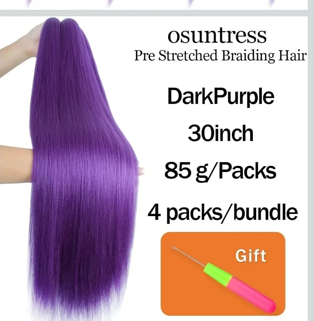 This OSuntress braiding hair comes in a dark purple colour. It's 30 inches long and has a Yaki texture. The hair is pre-stretched, not tangled, and easy to braid. It's also not shedding and easy to separate.