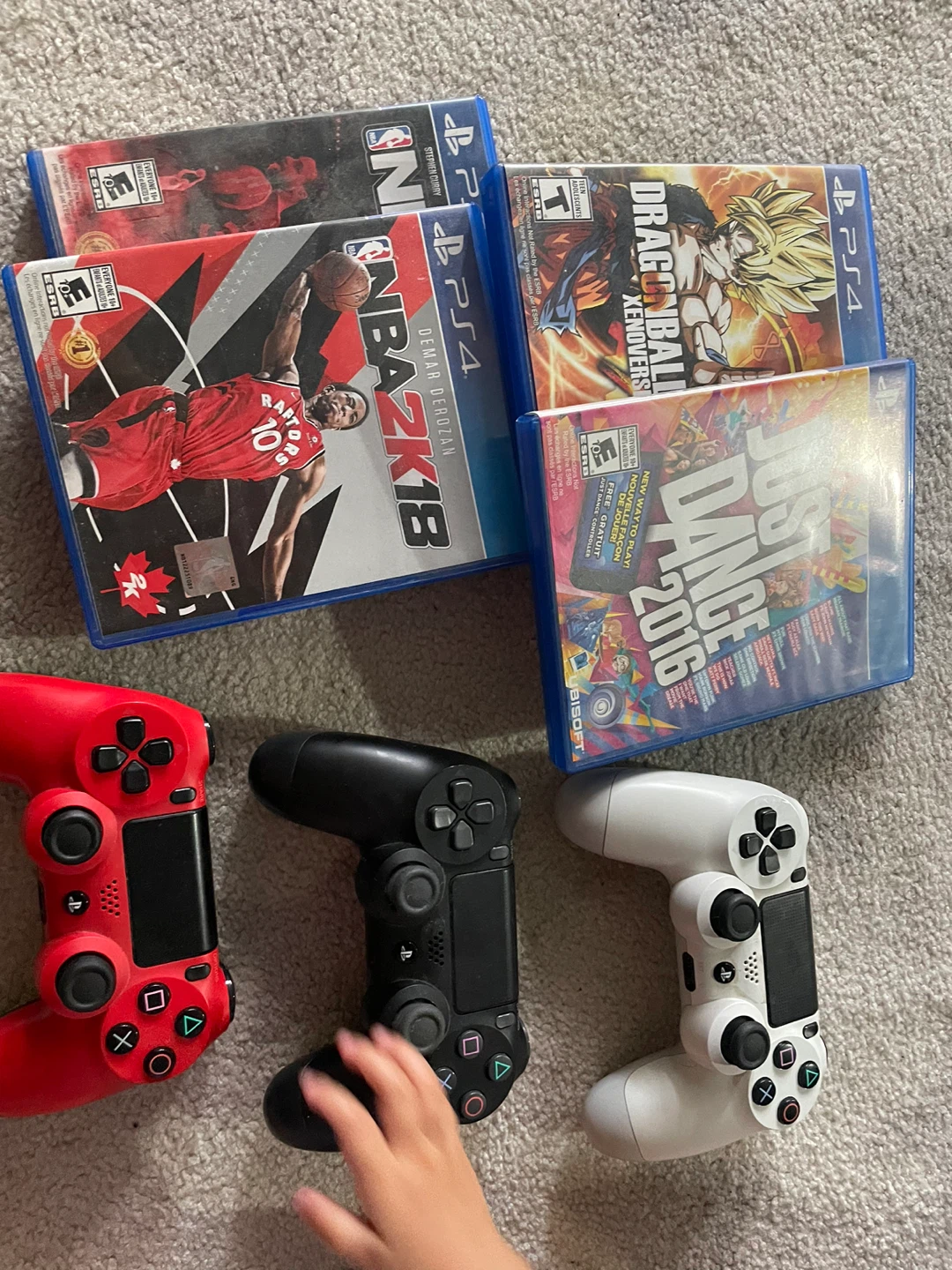 Selling a used PlayStation 4. It comes with several games including NBA 2K18, Dragon Ball Xenoverse, and Just Dance 2016. Also included are three controllers, one red, one black, and one white. Great for some fun!