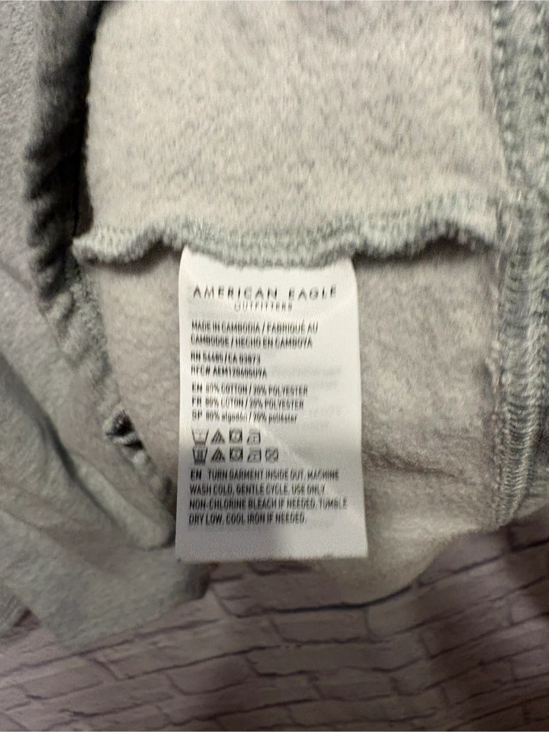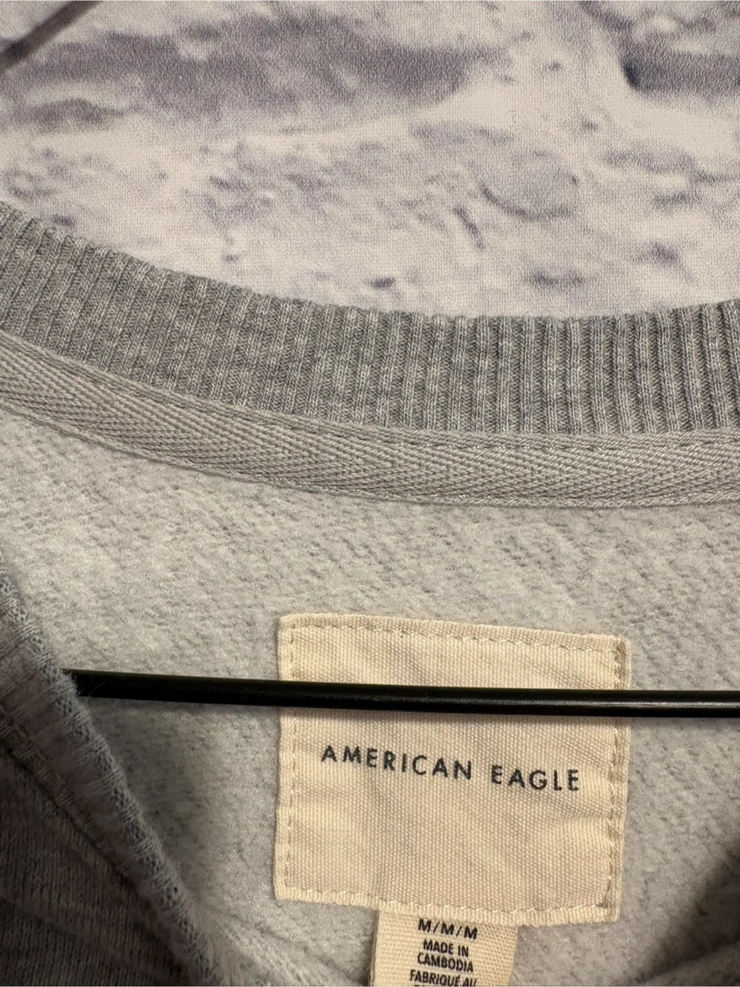 This is an American Eagle babydoll sweatshirt dress. It's a size medium and made of a soft grey material. It features gathered detailing at the waist and two side pockets. Excellent condition, pick up only.