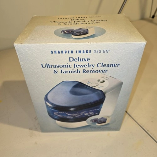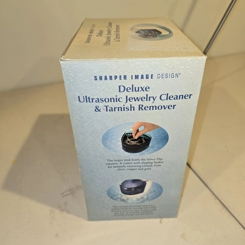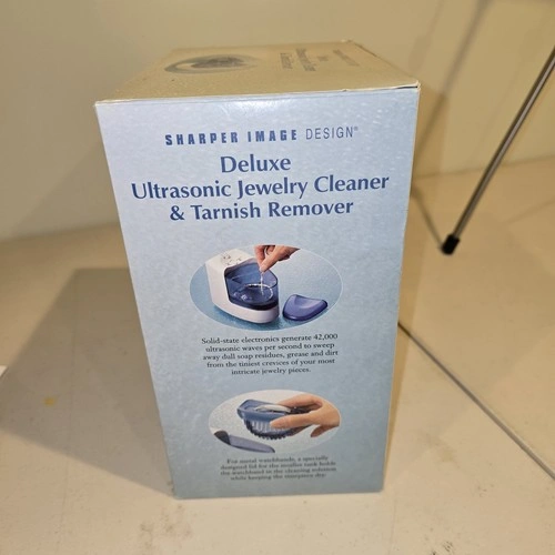 This is a brand new Sharper Image Design Ultrasonic Jewelry Cleaner. It uses sound waves to gently remove dirt and grime from your precious jewelry, helping to maintain its beauty and shine. Includes original box.