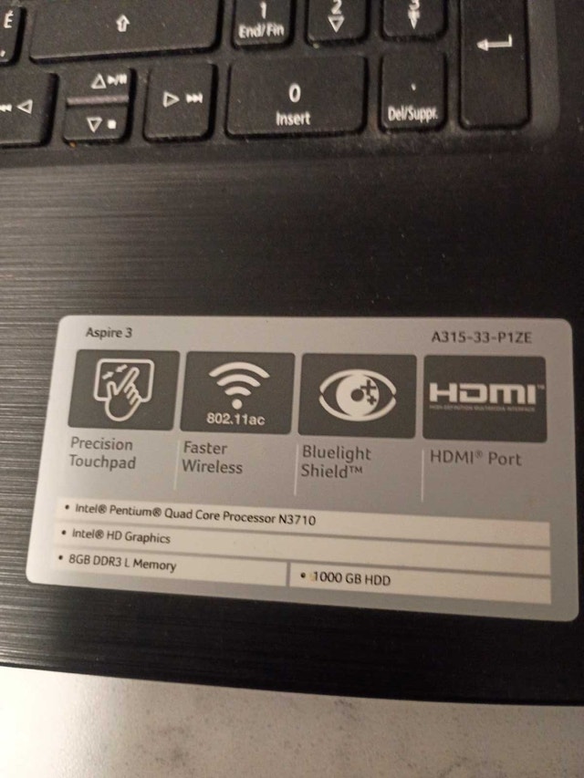 This Acer Aspire 3 laptop is suitable for everyday tasks. It features an Intel Pentium Quad Core N3710 processor, 8GB of DDR3L memory, and a 1000GB HDD. The laptop is used and in fair condition, showing signs of wear but is fully functional. Specs include: Intel Pentium Quad Core N3710 Processor, 8GB DDR3 L Memory, 1000 GB HDD, Precision Touchpad, Faster Wireless 802.11ac, Bluelight Shield, and HDMI Port. If you're seeing this ad, the laptop is still available.