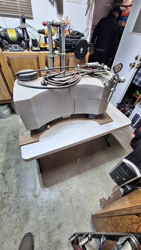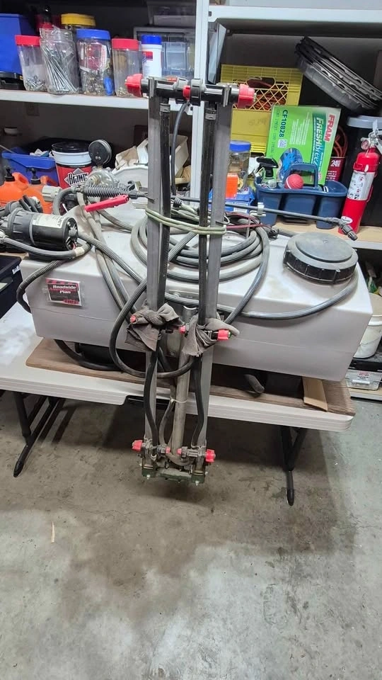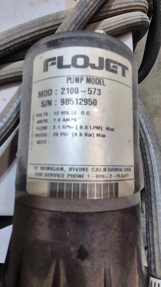 Complete Spraytech 20 gallon tank sprayer has a Flojet 2100-573 pump. Pump is 12 volts DC, 2.1 GPM, and 70 PSI max. It includes the spray boom, hoses, and a pressure gauge. Great for yard work or farm tasks.
