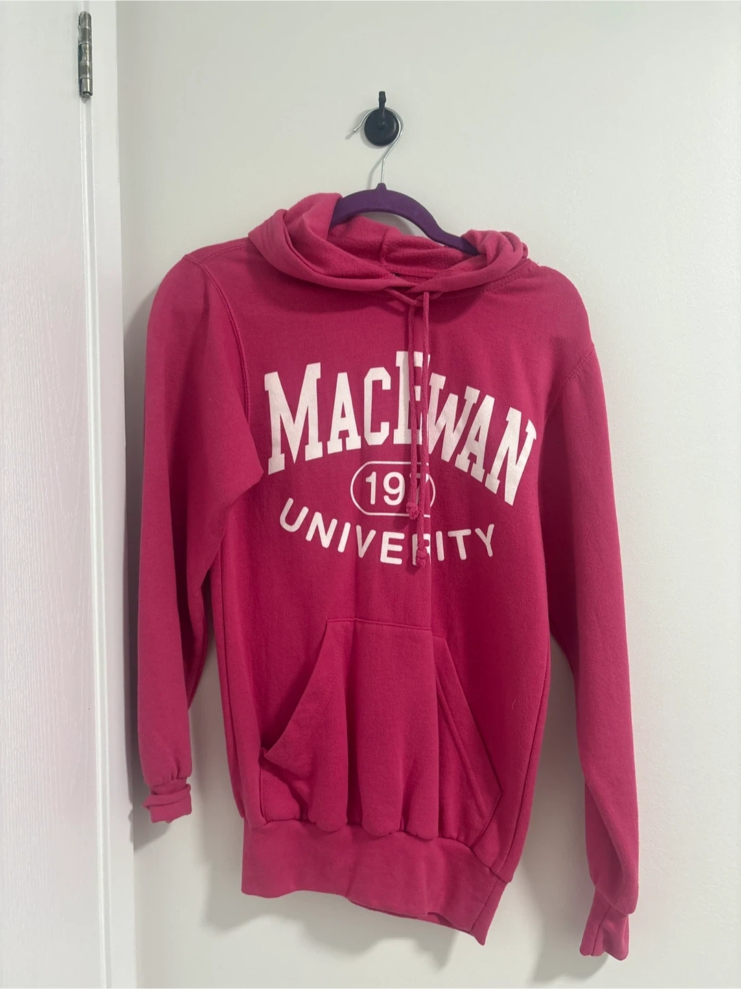 Pink MacEwan University hoodie with "1971" date. Classic pullover style with a front pouch pocket and drawstring hood. Perfect for students or alumni! Pick up cash only