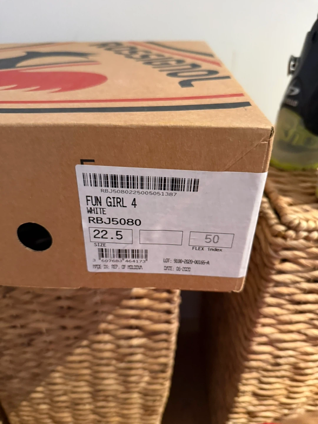 These Rossignol Fun Girl ski boots are white with pink accents. They're a size 22.5 with a flex index of 50. These boots are designed for young skiers looking to improve their skills on the slopes. Includes original box.