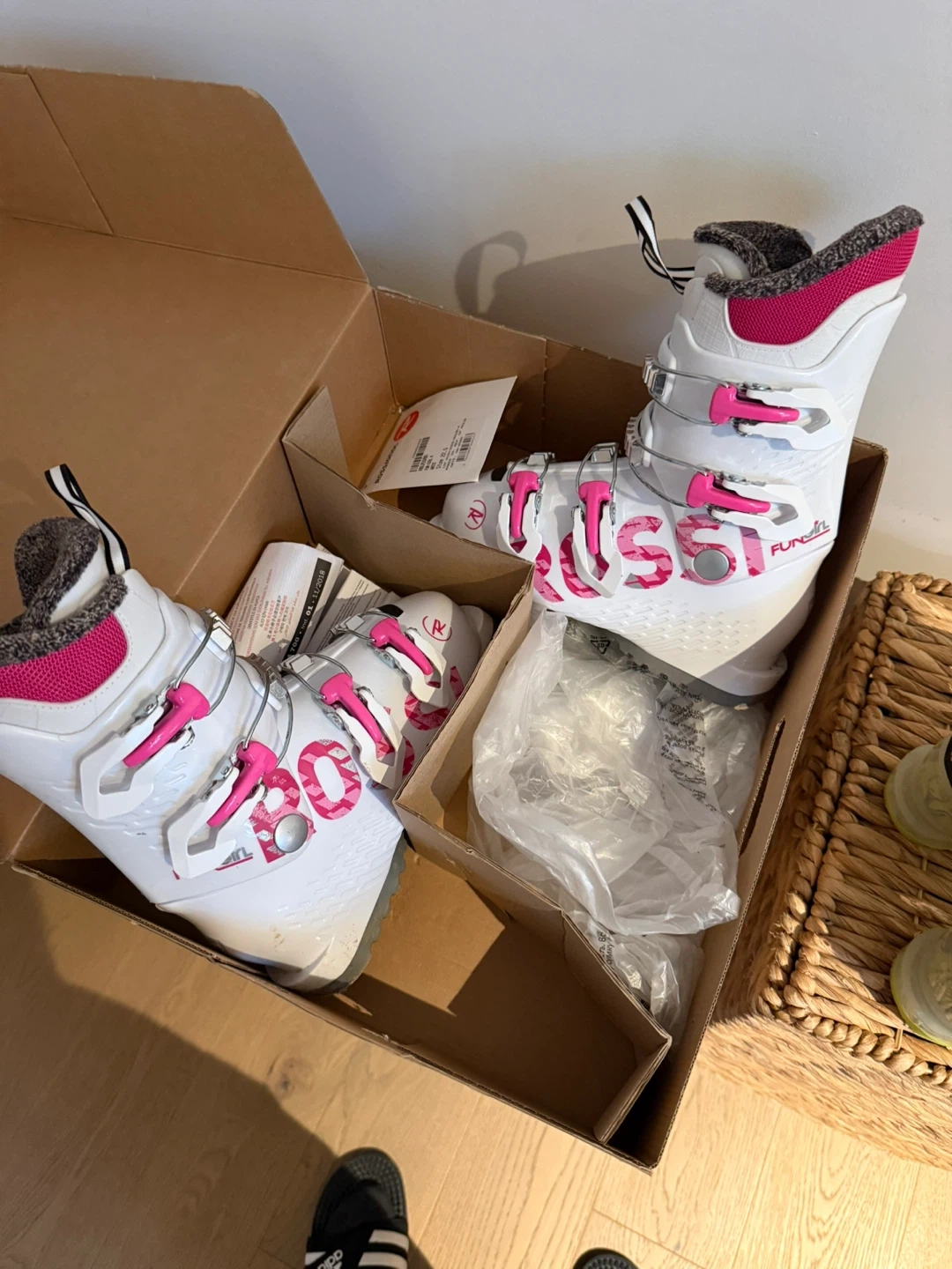 These Rossignol Fun Girl ski boots are white with pink accents. They're a size 22.5 with a flex index of 50. These boots are designed for young skiers looking to improve their skills on the slopes. Includes original box.