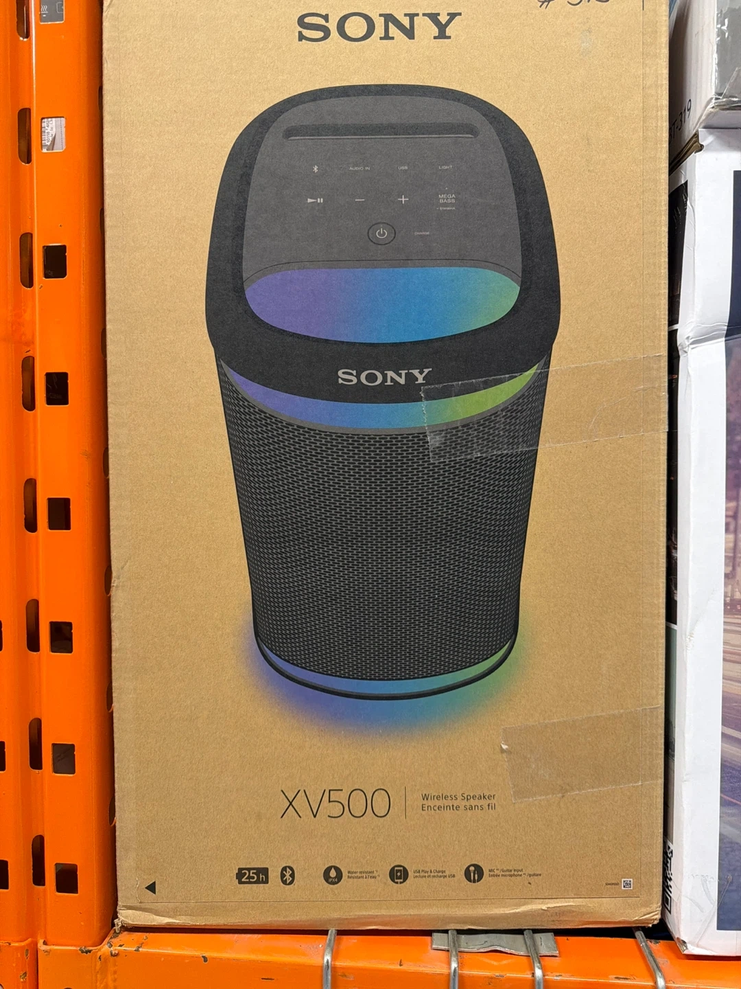 Sony XV500 wireless speaker with Mega Bass. It has 25-hour battery life and is IPX4 water resistant. USB Play & Charge is supported.