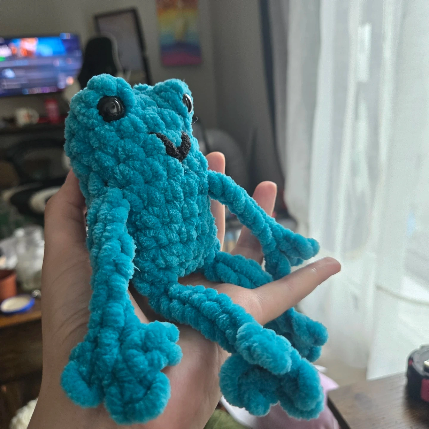 Cute teal frog plush toy, handmade with soft chenille yarn. It's got cute button eyes and a stitched smile. This little guy is perfect for cuddling or as a cheerful decoration!