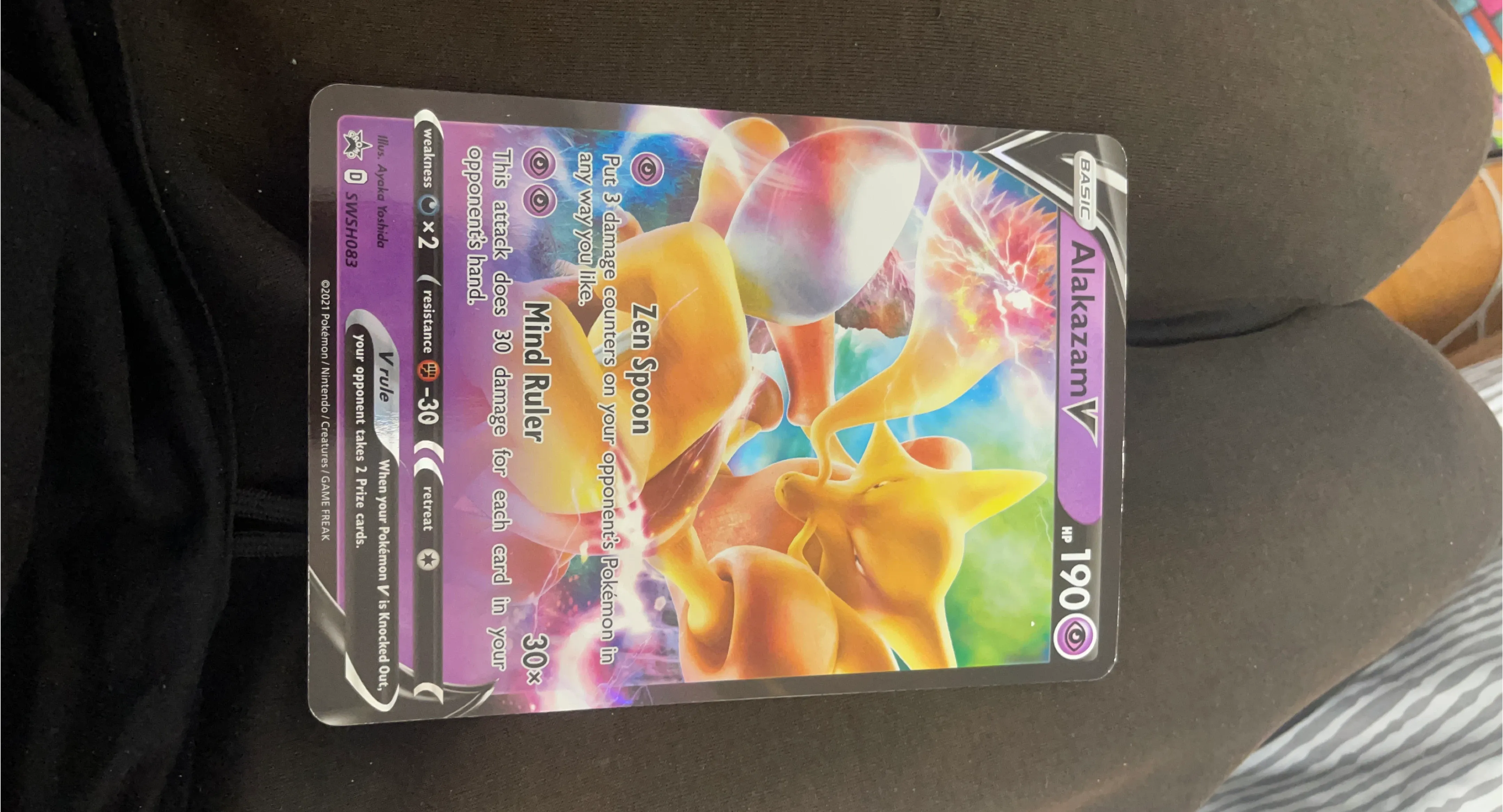 This is a Pokemon Alakazam V trading card, part of the SWSH083 set. It has 190 HP and features the "Zen Spoon" and "Mind Ruler" attacks. The card is from the 2021 Pokémon/Nintendo set. It's a basic V rule card.