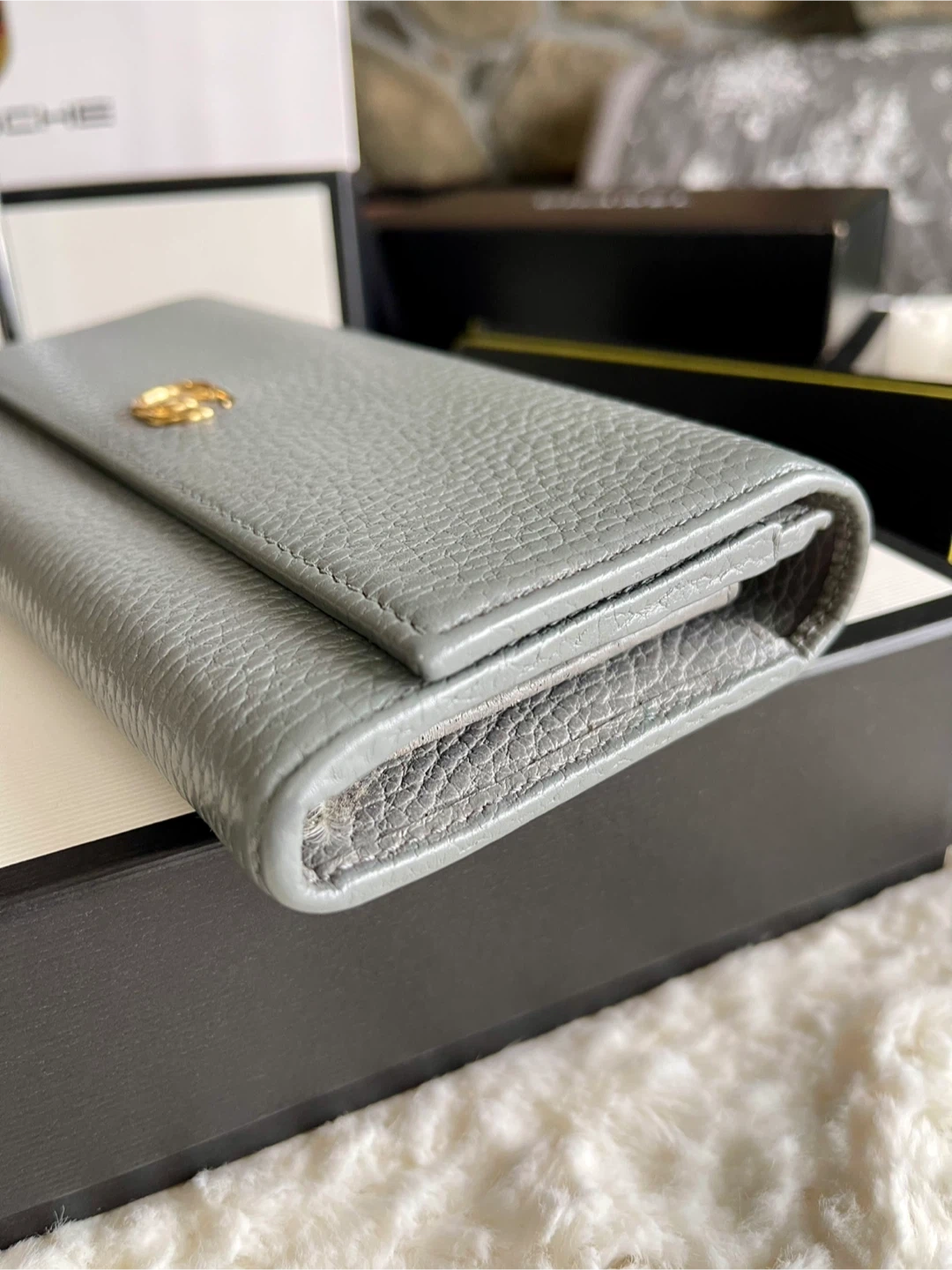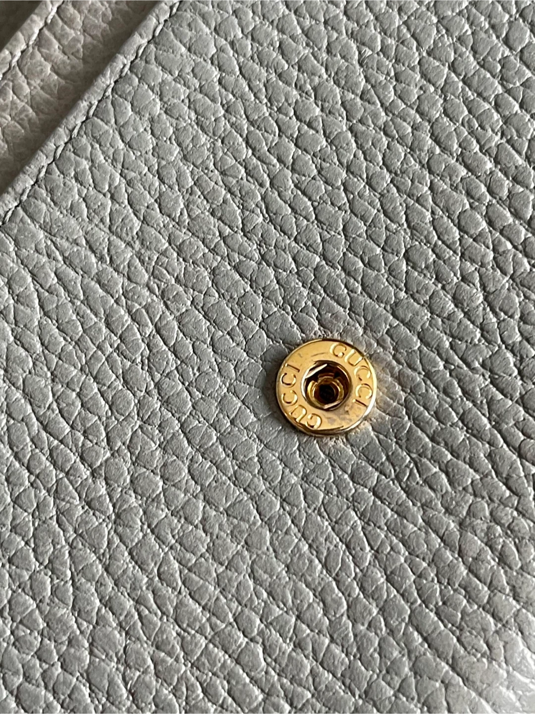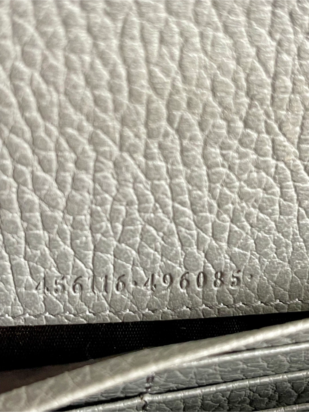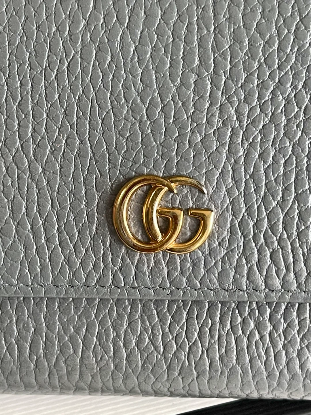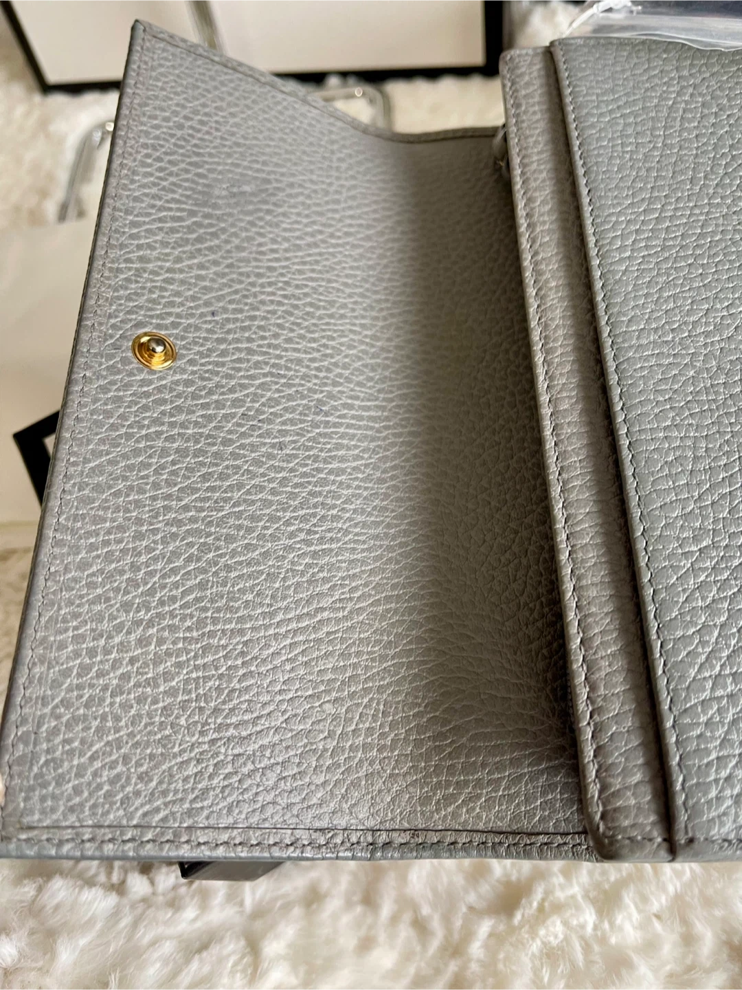 This is a grey Gucci GG Marmont wallet. It's made from textured leather with a gold-tone GG logo closure.