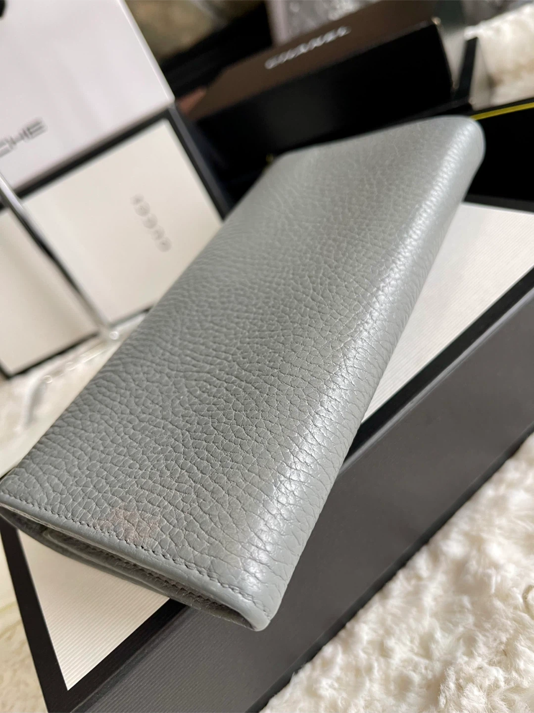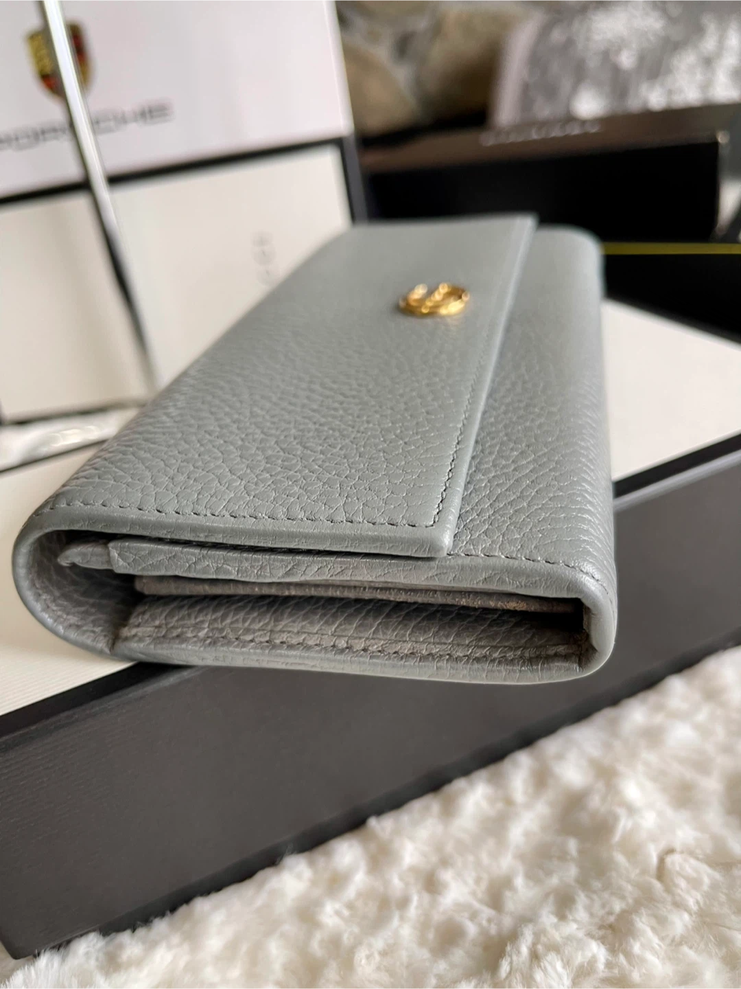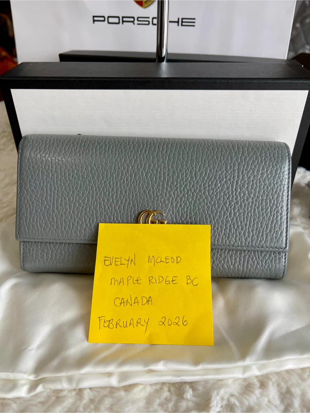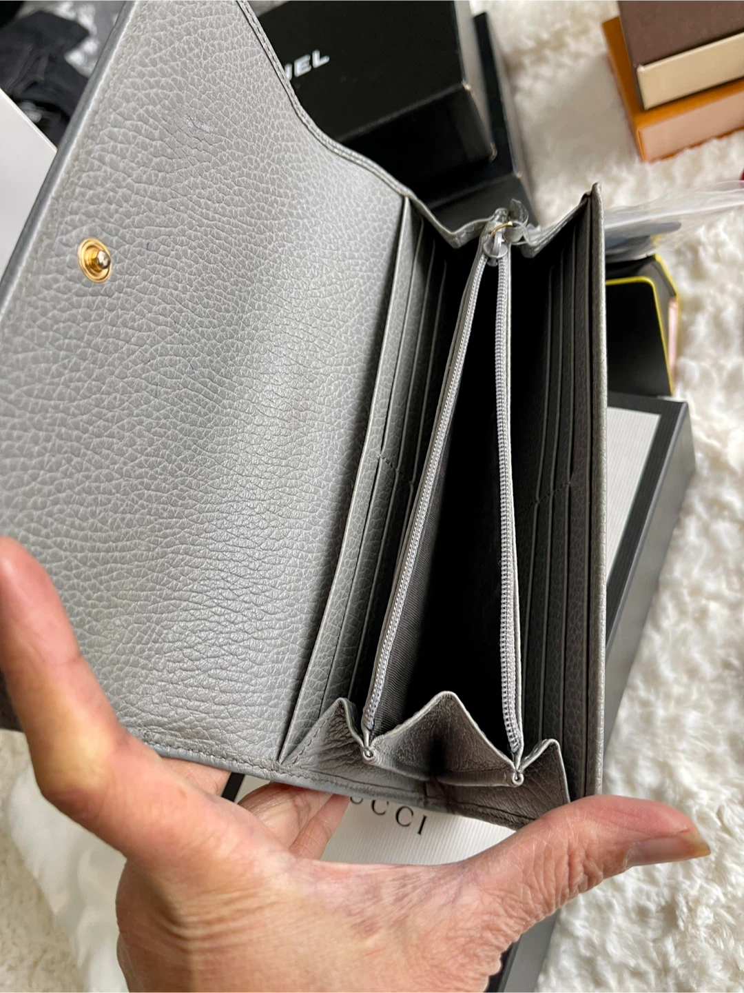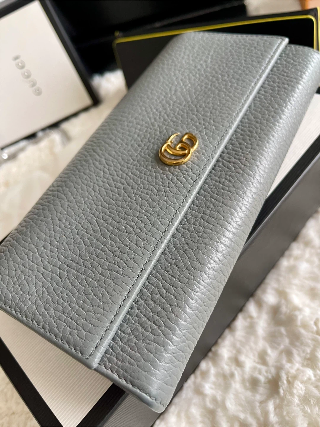 This is a grey Gucci GG Marmont wallet. It's made from textured leather with a gold-tone GG logo closure.