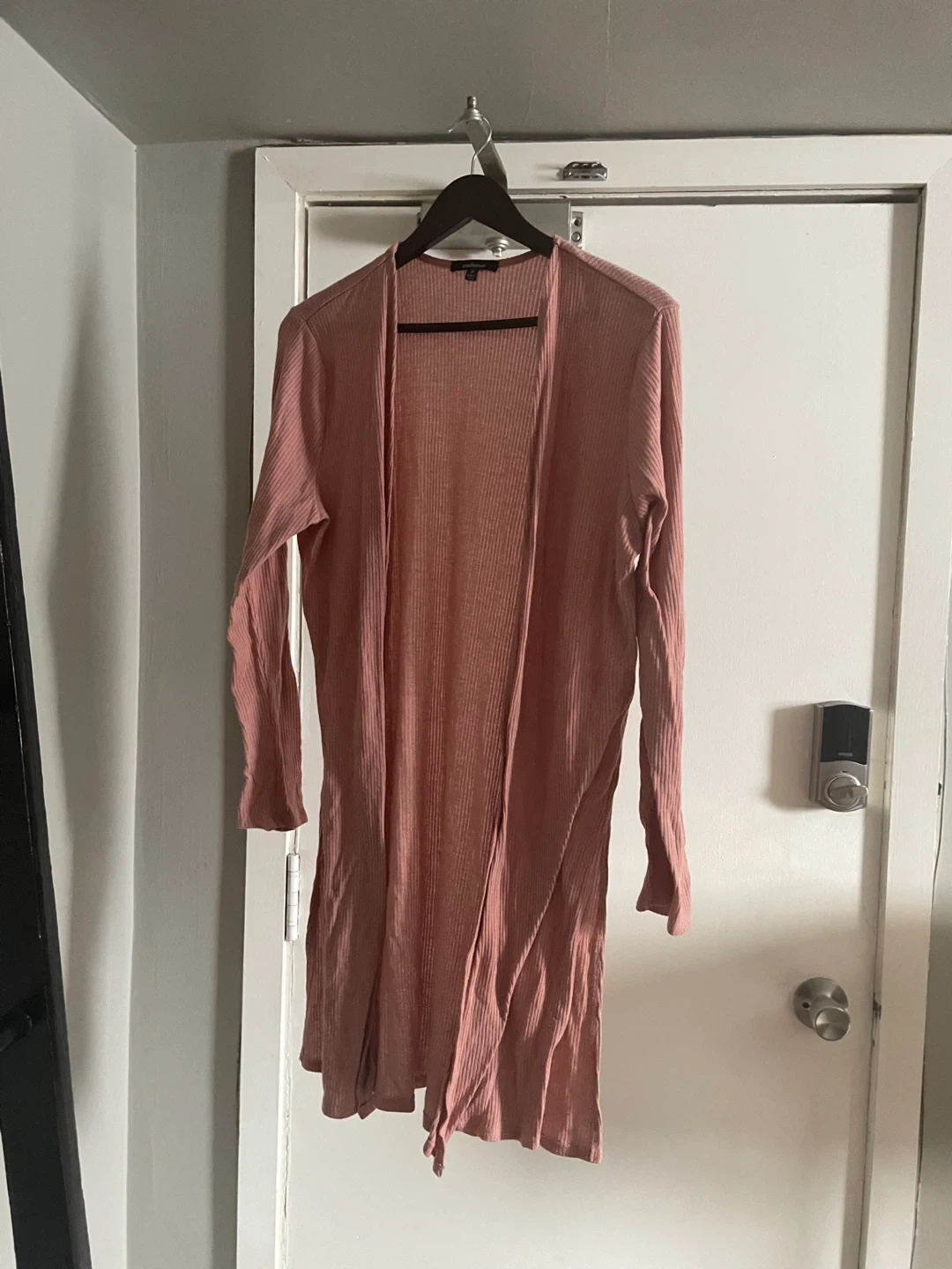 Light pink ribbed longline cardigan. It's made of a soft, stretchy material. This piece is great for layering over outfits. Pick up only. Cash only.