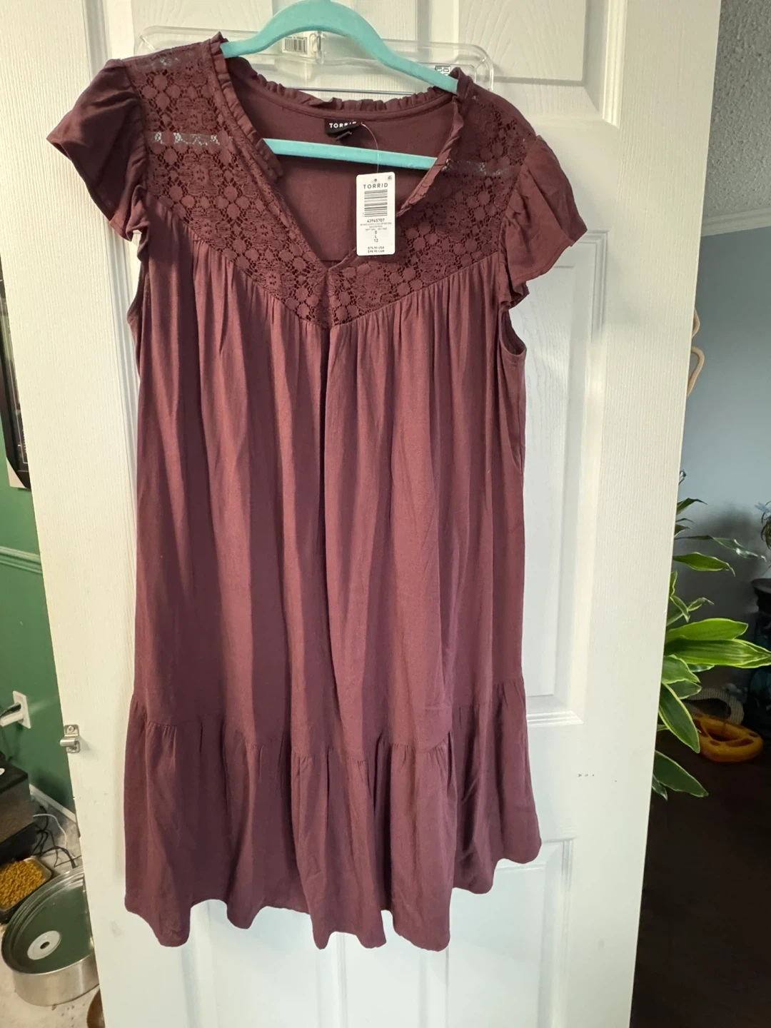 This TORRID dress features a beautiful lace yoke detail and ruffle sleeves. It's a comfy V-neck style with a tiered hem. The material's soft and flowy.