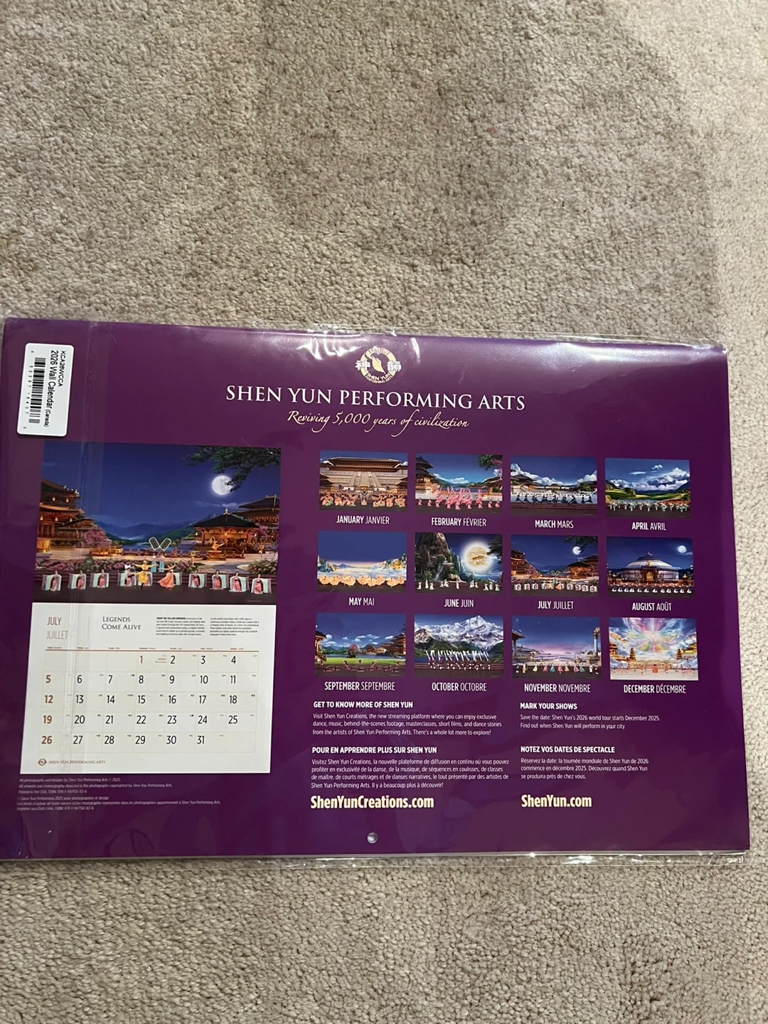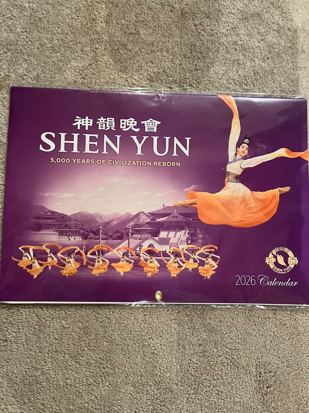 This is a Shen Yun Performing Arts 2026 calendar. It features vibrant artwork and photography showcasing the company's performances.