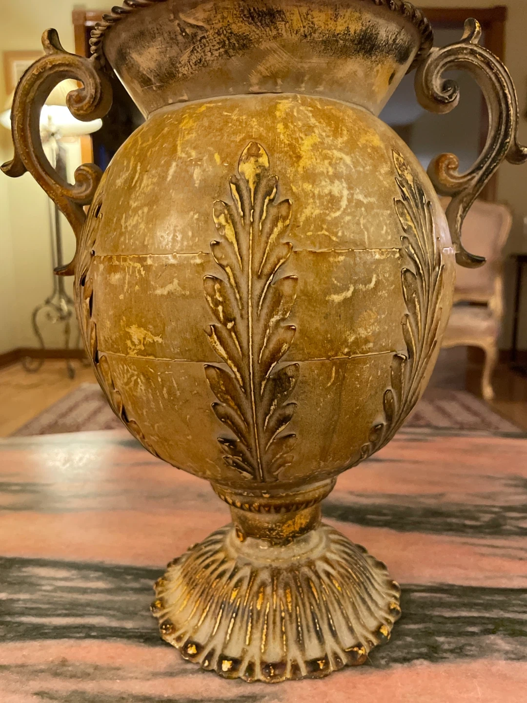 This urn features an ornate design with leaf motifs and two handles. It has a distressed gold and antique black finish. It's suitable for decorative purposes or as a statement piece in your home.