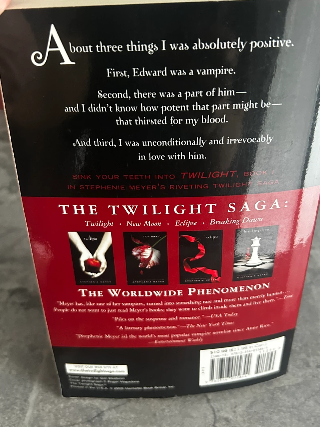 Twilight: The Twilight Saga, Book 1 by Stephenie Meyer. This paperback edition features the iconic cover art and is a New York Times bestseller. It's the first book in the riveting Twilight Saga series.