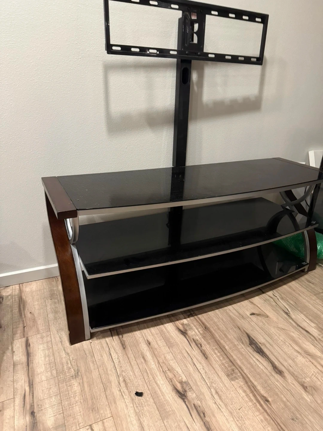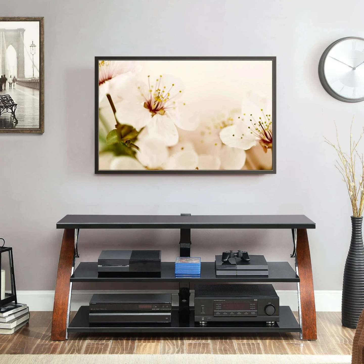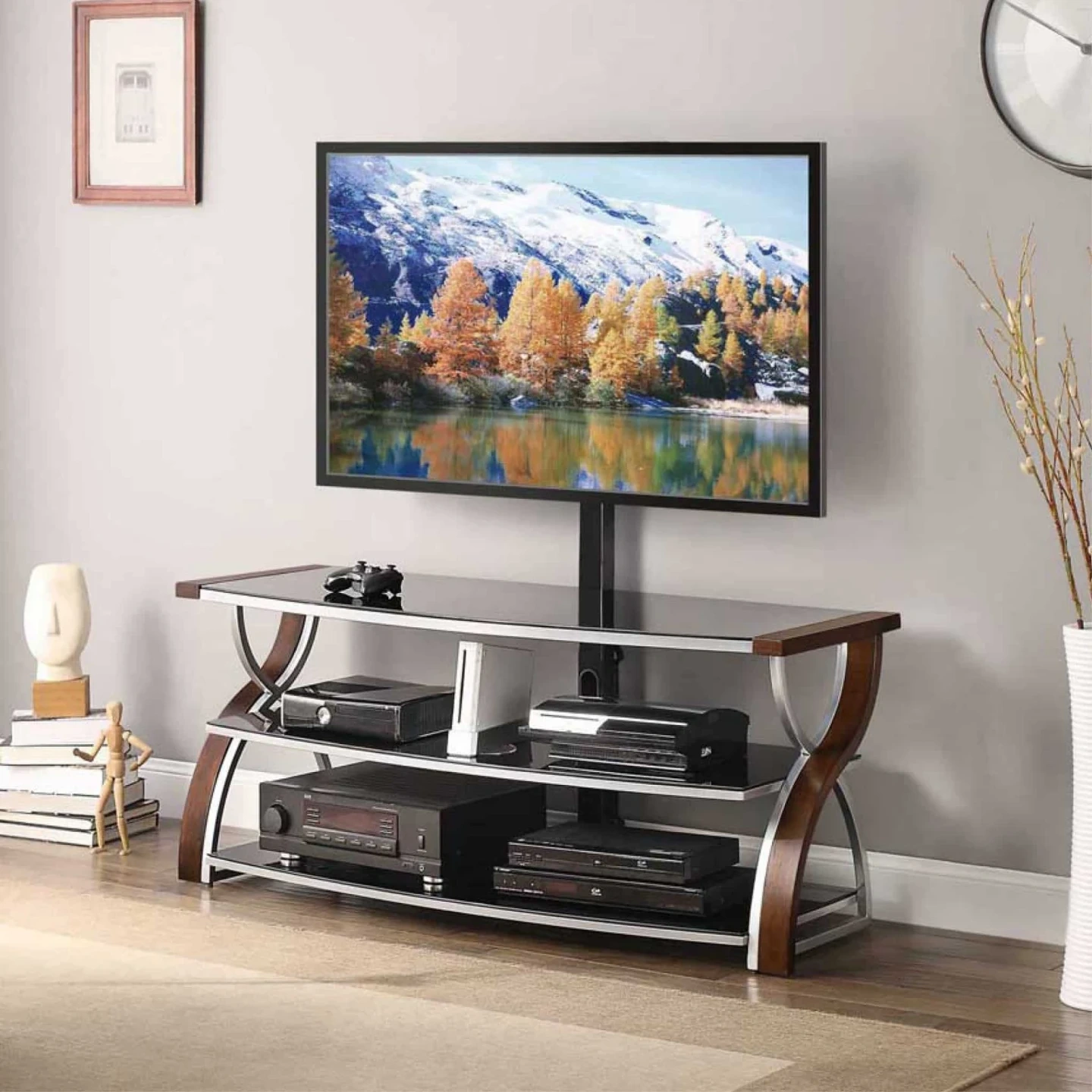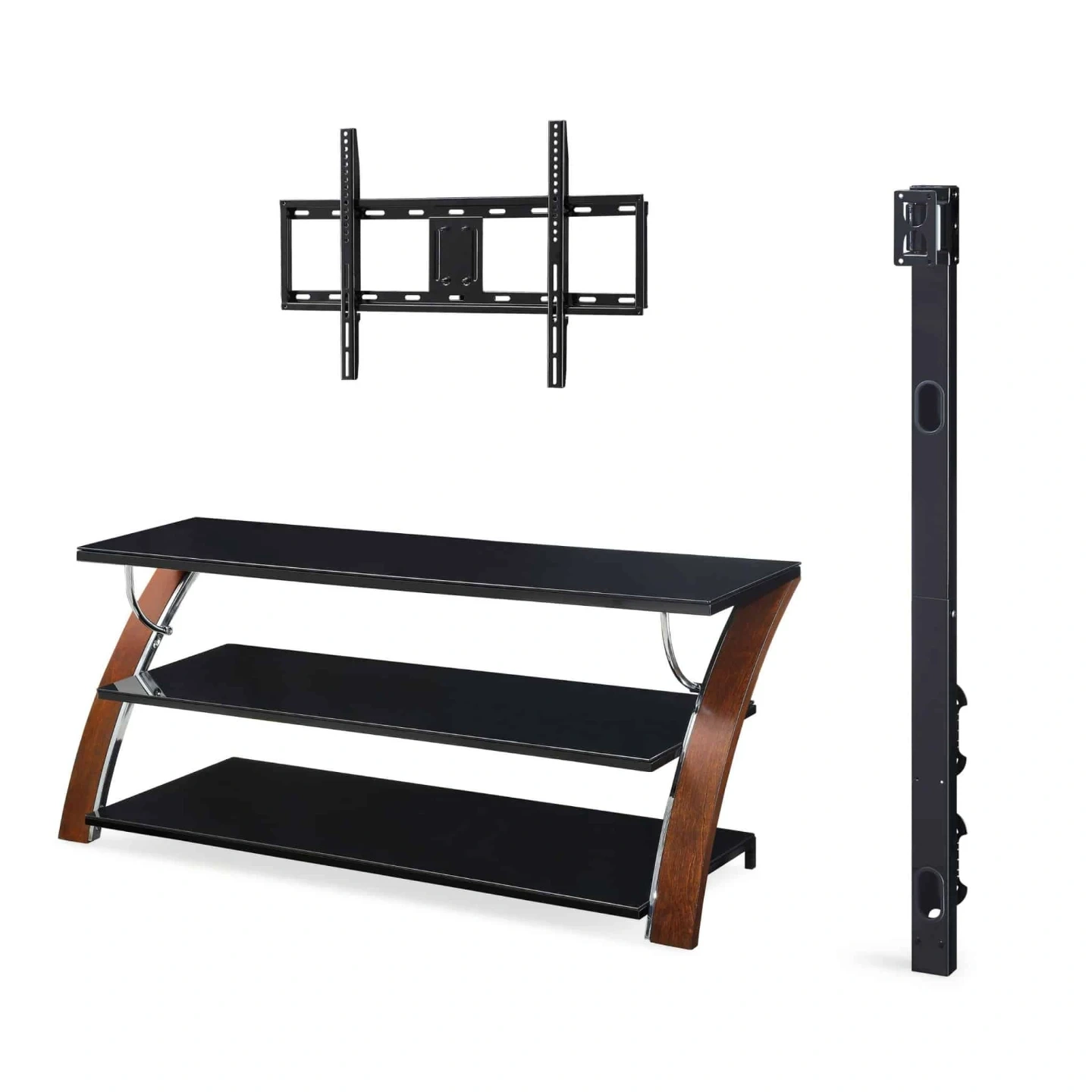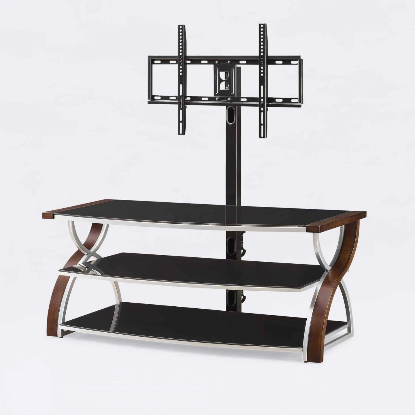 This Whalen Furniture BBXL54NV 3-in-1 console accommodates TVs up to 65″ and 135 lbs. It features 3 tempered-glass shelves, so you can keep your home theater organized. The 3-in-1 design lets you position your TV in swivel mount / swinging floater, wall mount and tabletop configurations for flexibility. The swivel mount lets you pan up to 45° left and right, Solid wood legs, sturdy metal frame and stylish opaque black glass shelves with open back making it easy to connect video equipment to your TV. Cable-gathering wheels help keep cords organized, so you can maintain a tidy home theater setup. A brown cherry primary finish, along with bent plywood legs with a birch veneer and a silver powdercoat finish, complements your existing décor.