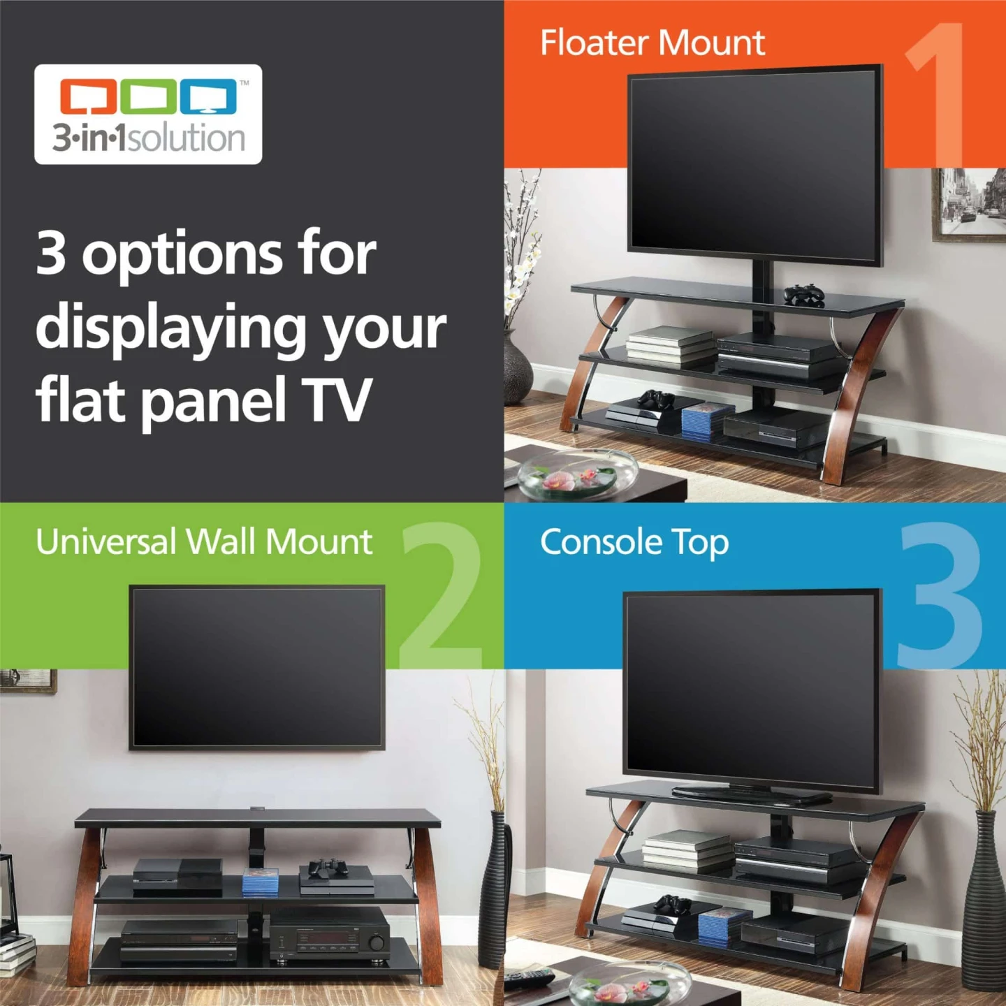 TV Stand is a 3-in-1 mounting solution console that enables you to mount your TV on the wall, spine bracket or tabletop. Incredibly durable design.