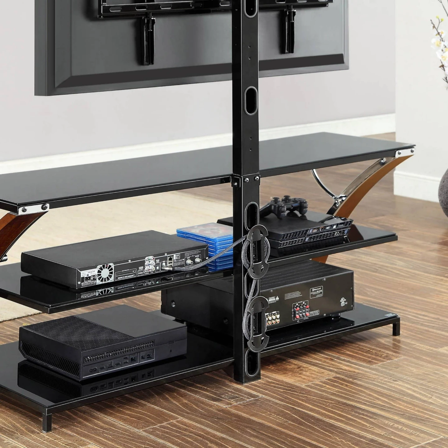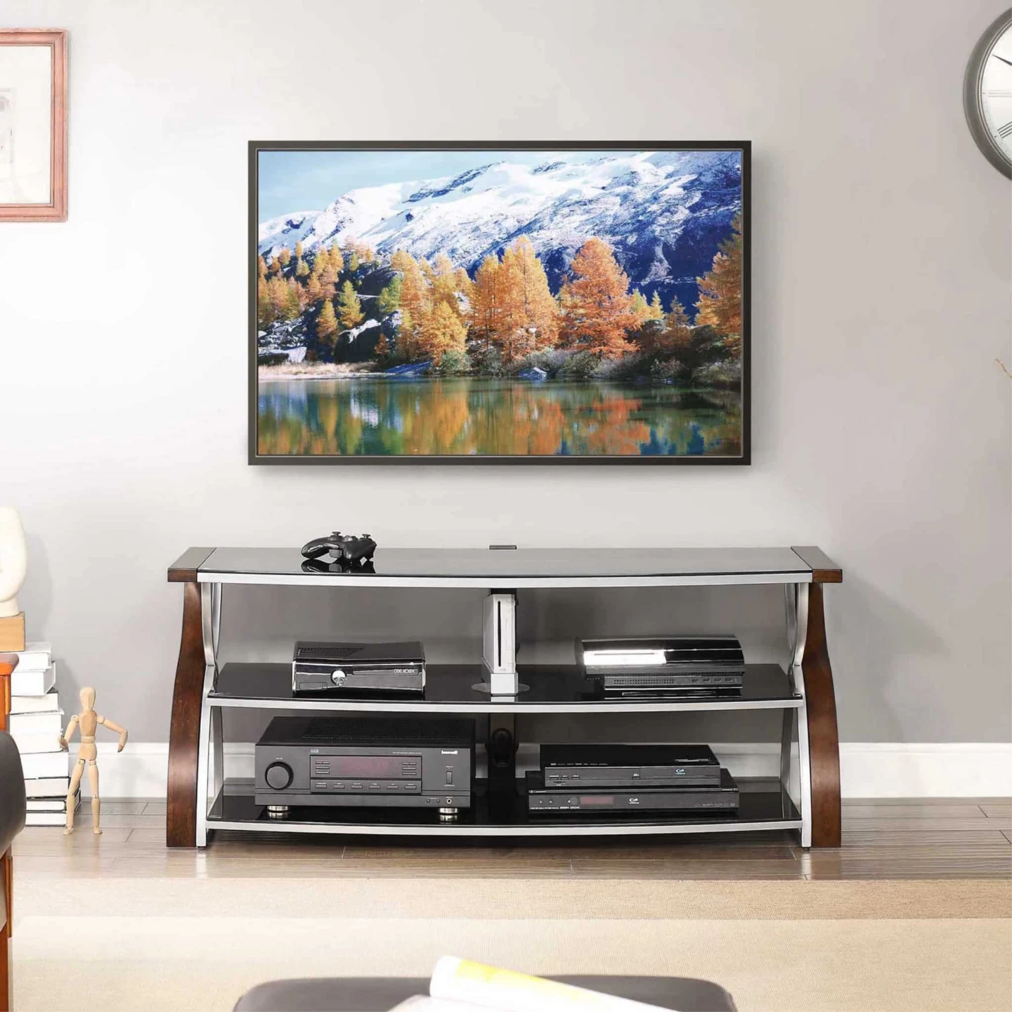 This Whalen Furniture BBXL54NV 3-in-1 console accommodates TVs up to 65″ and 135 lbs. It features 3 tempered-glass shelves, so you can keep your home theater organized. The 3-in-1 design lets you position your TV in swivel mount / swinging floater, wall mount and tabletop configurations for flexibility. The swivel mount lets you pan up to 45° left and right, Solid wood legs, sturdy metal frame and stylish opaque black glass shelves with open back making it easy to connect video equipment to your TV. Cable-gathering wheels help keep cords organized, so you can maintain a tidy home theater setup. A brown cherry primary finish, along with bent plywood legs with a birch veneer and a silver powdercoat finish, complements your existing décor.