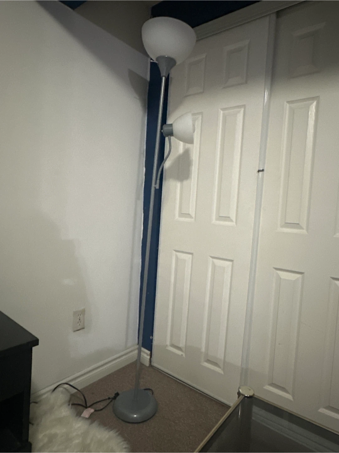 Selling a floor lamp with an adjustable reading light! It's in great condition and perfect for adding some extra light to any room. The lamp features a sleek, modern design with a grey finish that will complement any decor. It also has a convenient reading light that can be adjusted to direct light where you need it most. Great for reading or studying!