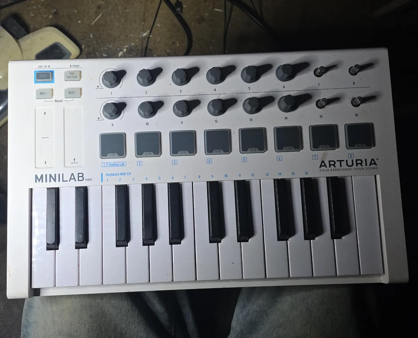 This is the Arturia Minilab MkII MIDI keyboard controller. It's a compact keyboard with 25 velocity-sensitive mini-keys. Features 8 performance pads and 16 rotary knobs. Includes USB and sustain pedal inputs.