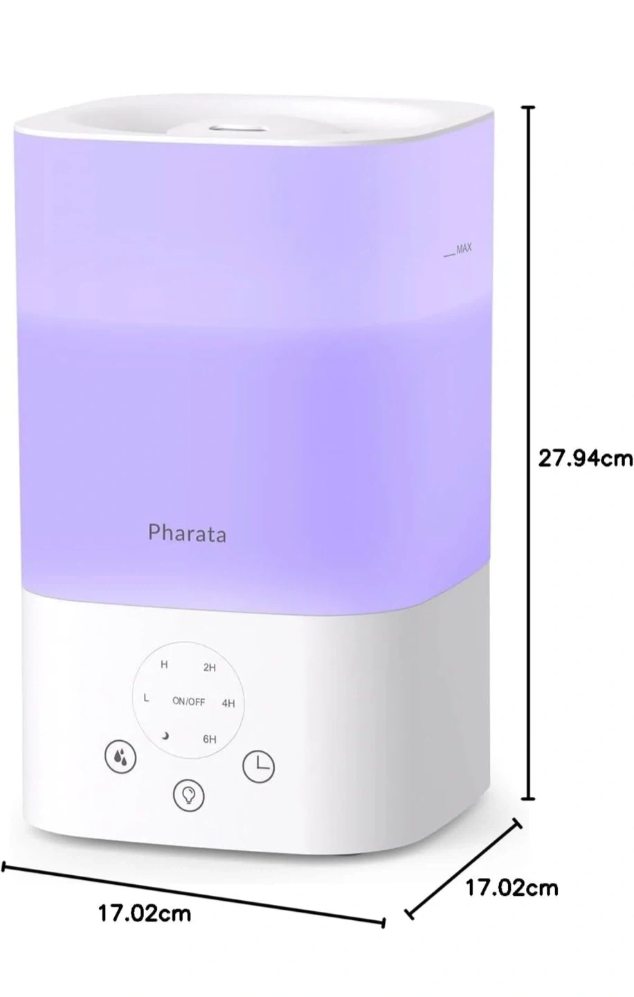 This Pharata humidifier has a 3.5 liter capacity for easy top fill. It features a fix light color option and timer settings for 2, 4, or 6 hours. The unit's dimensions are 17.02cm x 17.02cm x 27.94cm.