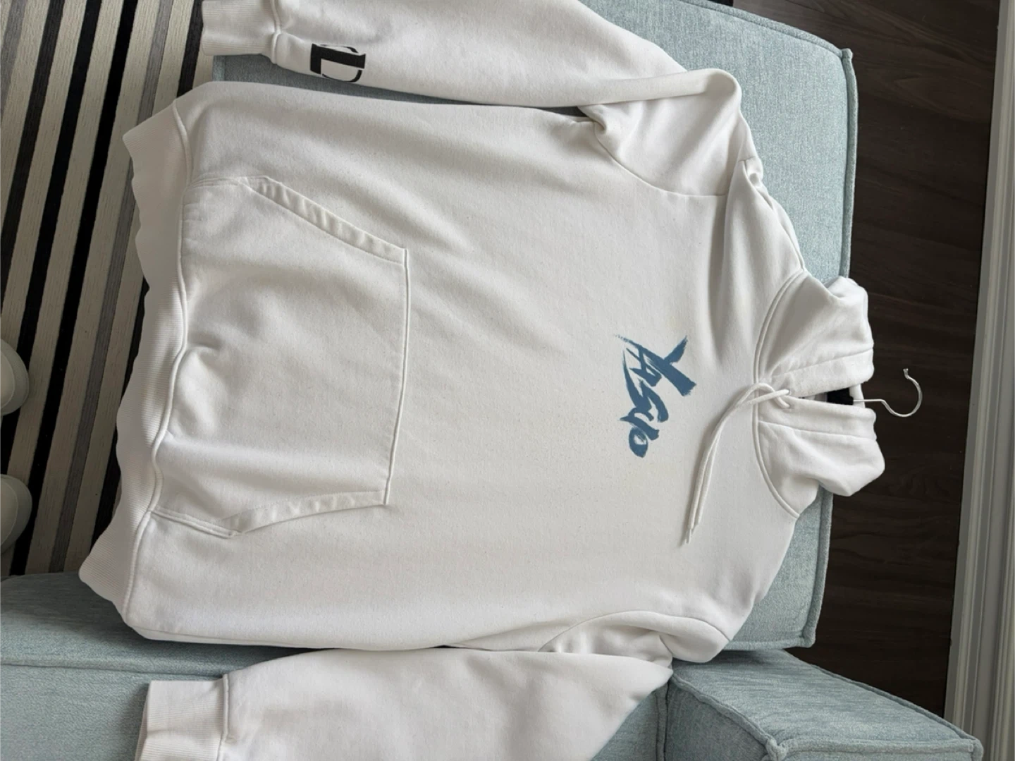 White H&M hoodie featuring artwork of Yasuo from League of Legends. It's a size medium. Made from a comfortable cotton blend.