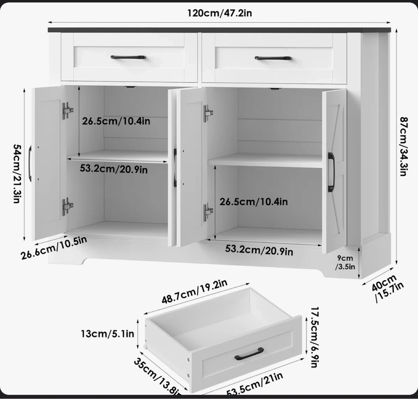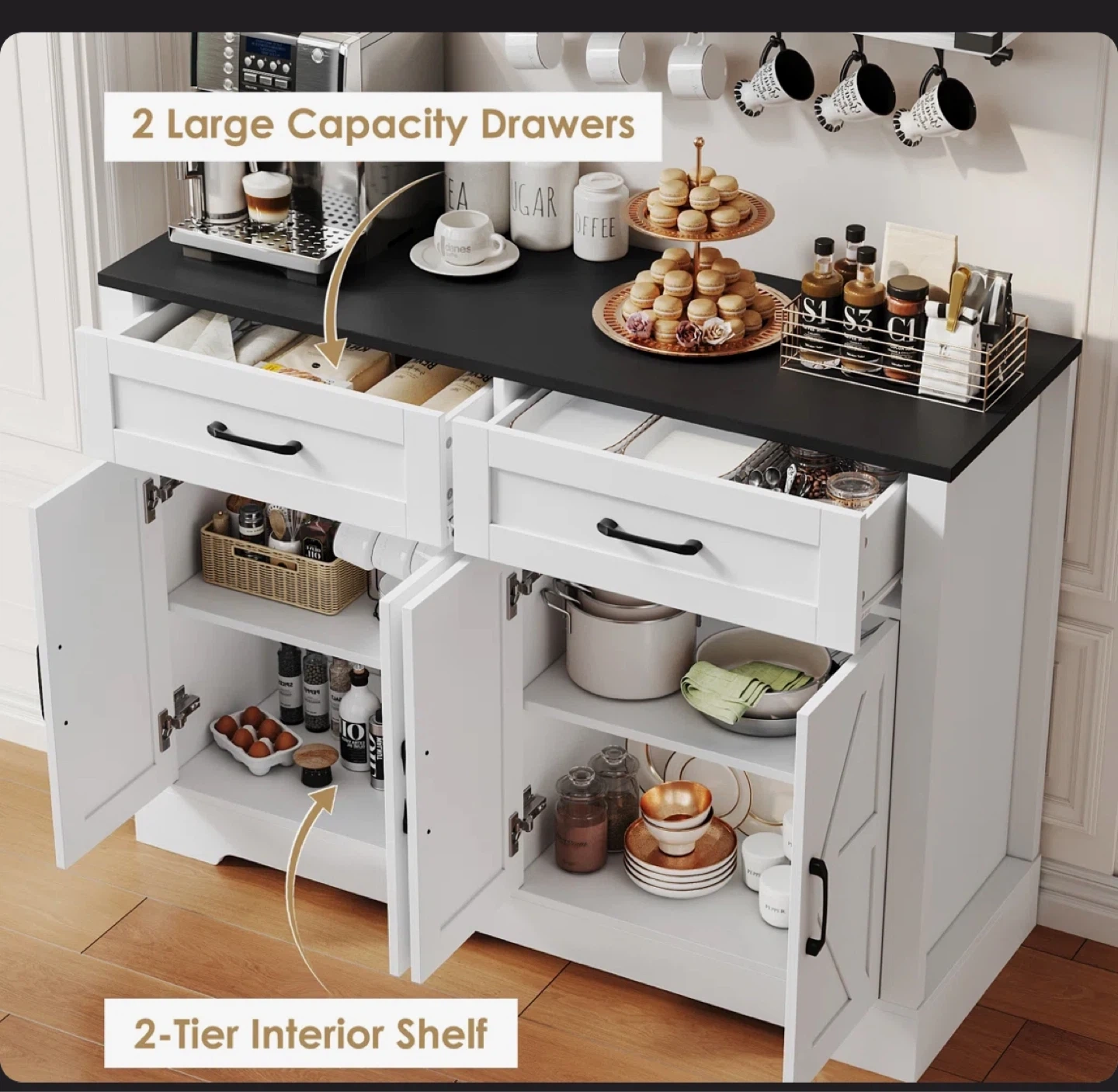 White buffet with black top and dark hardware. Two drawers and four cabinet doors for storage. This piece offers ample space for dining essentials or decor. Great for a dining room or living area! This sideboard features a classic country style and a minimalist look. The 47.2" wide counter offers you plenty of space to store dishes and tablecloths as well as to place decorative objects. 2 large drawers and a 4-door cabinet offer large storage space, ideal for storing plates and utensils