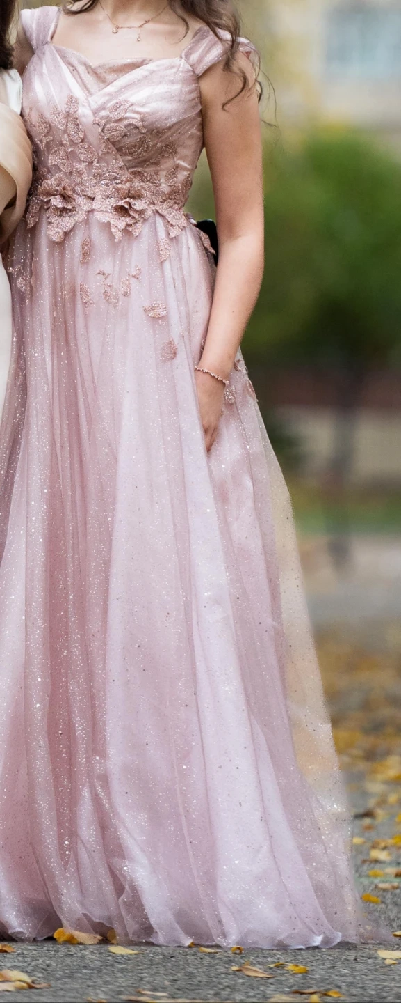 This stunning pink tulle evening dress features a sparkling glitter overlay and intricate rose gold floral appliqué detailing along the bodice and waist. It has a flattering V-neckline and cap sleeves, with a full, flow. The dress is perfect for wedding and graduation events. This dress was worn 1 time, perfect condition.