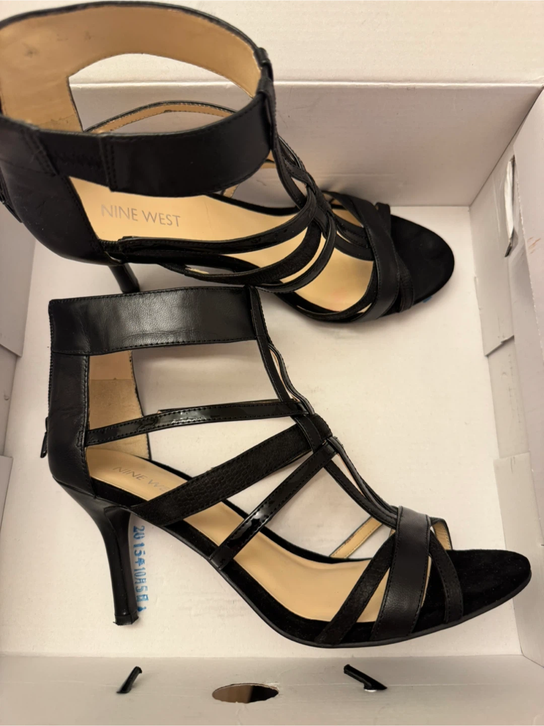 Selling a pair of Nine West black heels in size 8.5. These stylish heels come with their original box and feature a leather/man-made upper and man-made lining. Perfect for a night out or special occasion!
