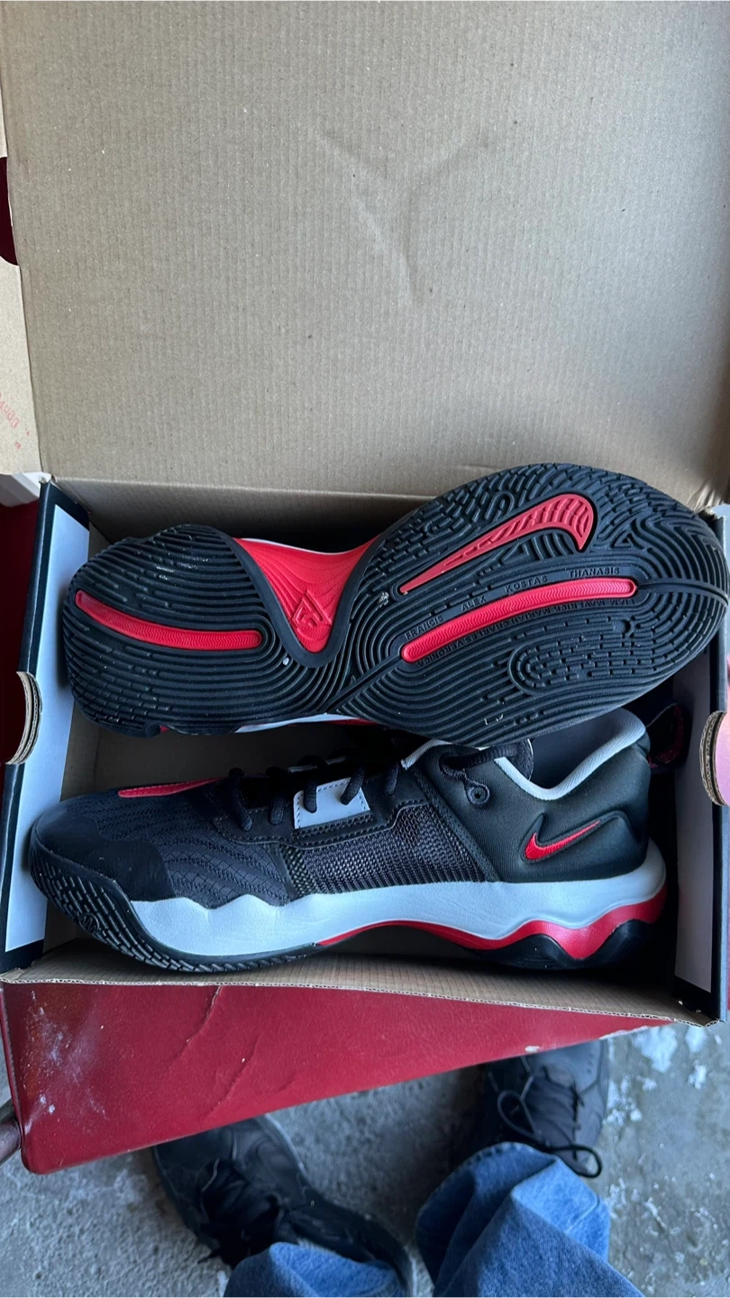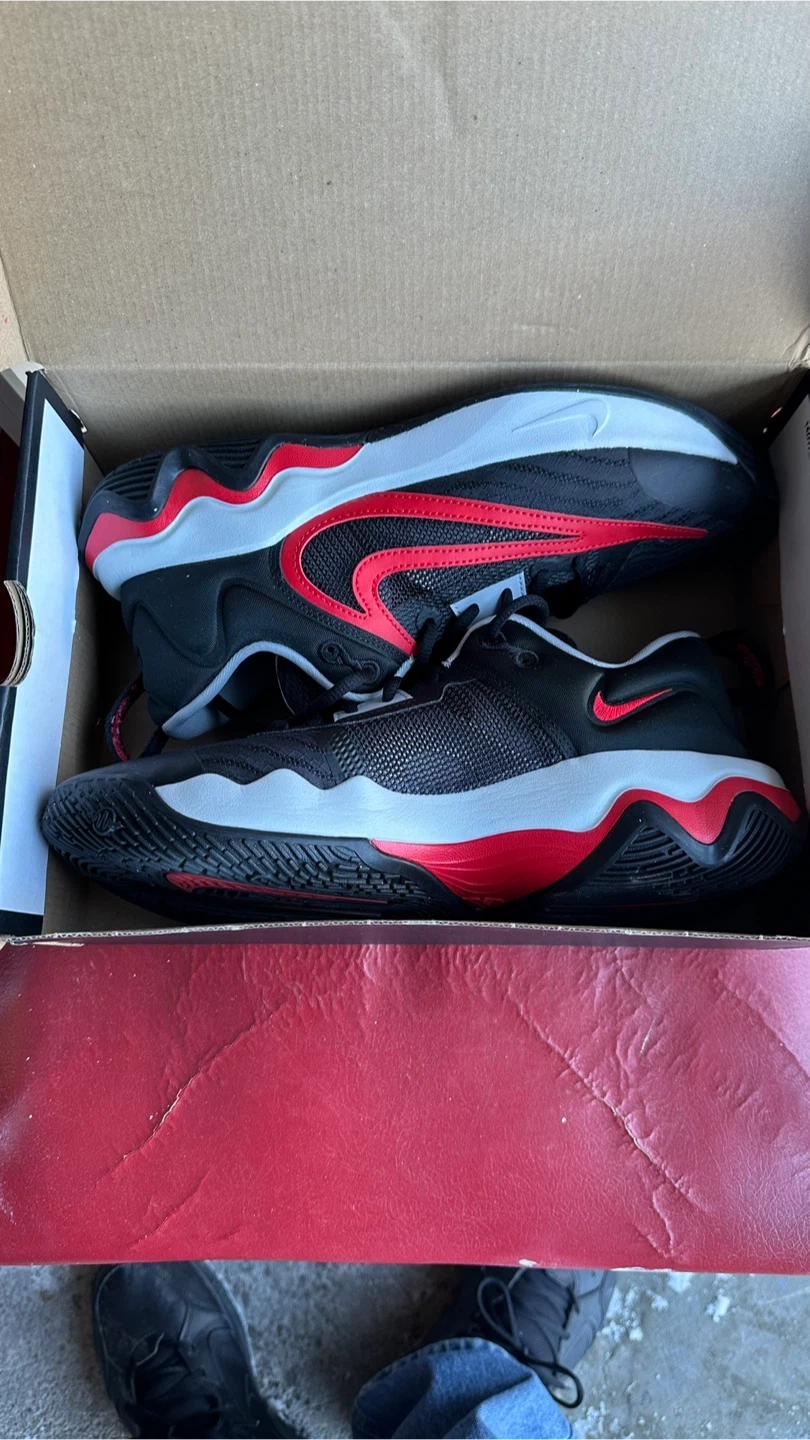These are a pair of Nike Air Jordan 1 Low basketball shoes in black, red, and white. The shoes are a men's size 9.5. They come with the original box. Perfect for the court!