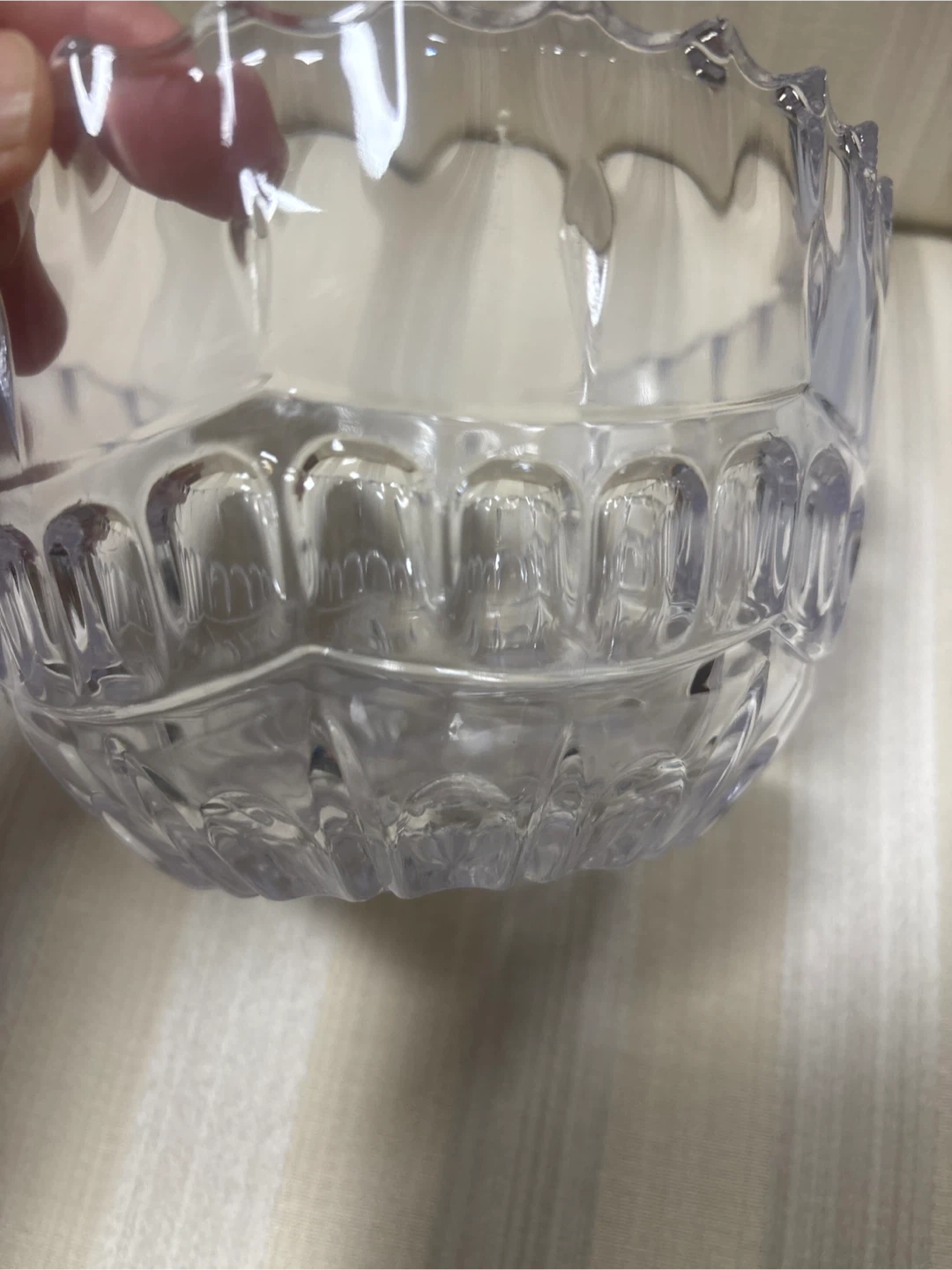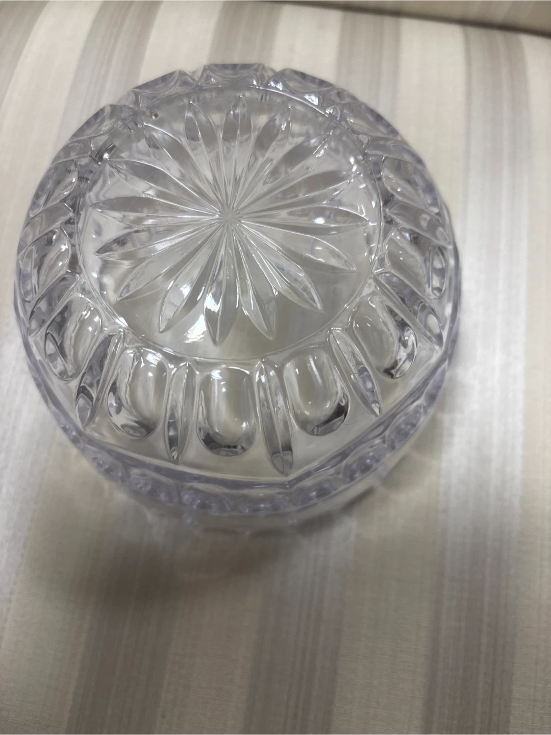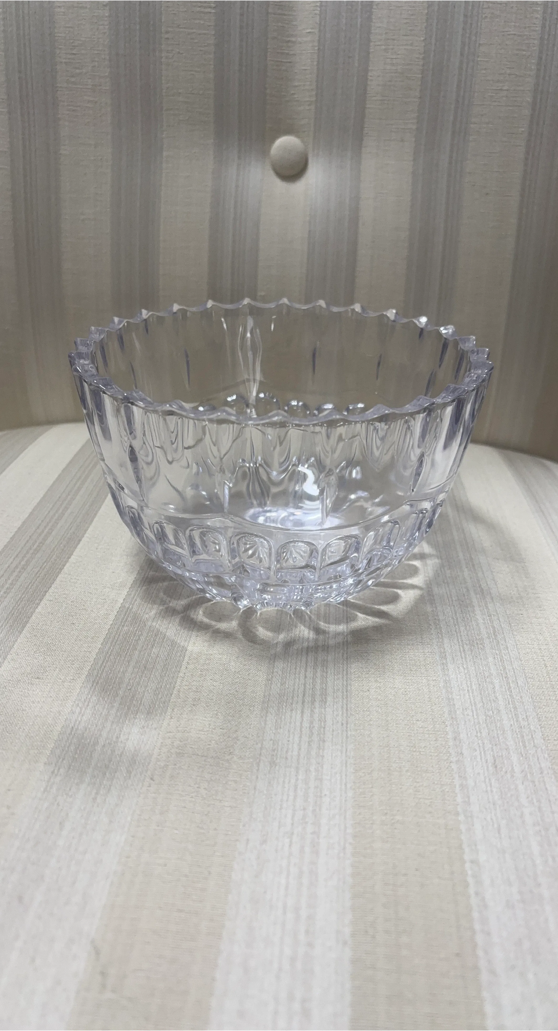 This is a clear glass decorative bowl. It features a cut glass design with a fluted rim. This bowl would be lovely for holding small items or as a decorative accent piece.