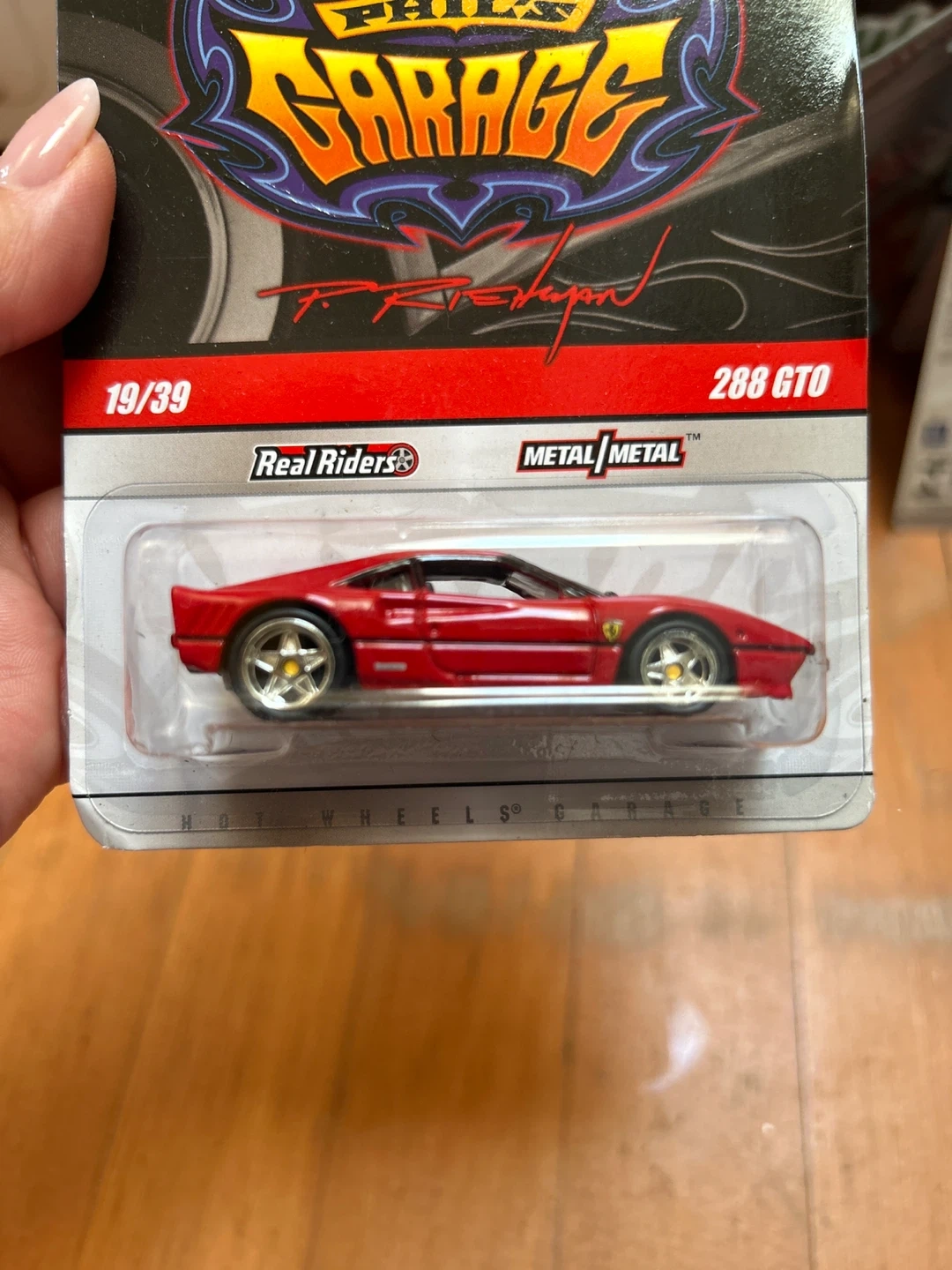 This is a red 288 GTO Hot Wheels car from Phil's Garage series. It features Real Riders wheels and Metal Metal construction. Perfect for collectors!