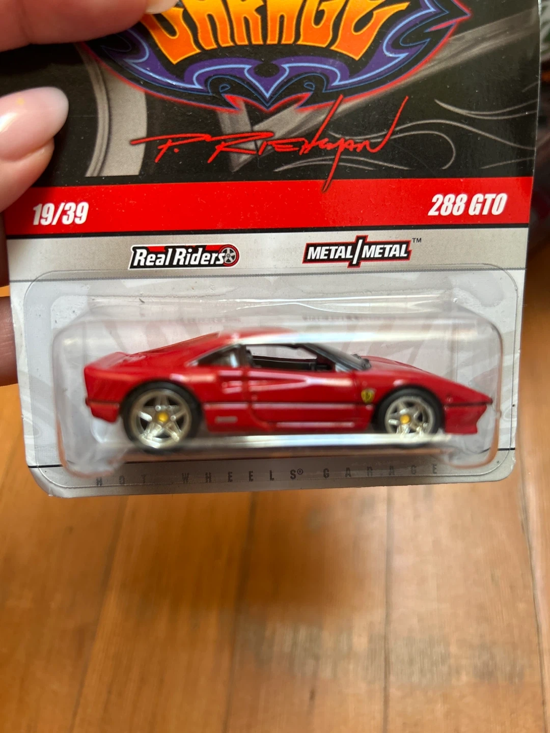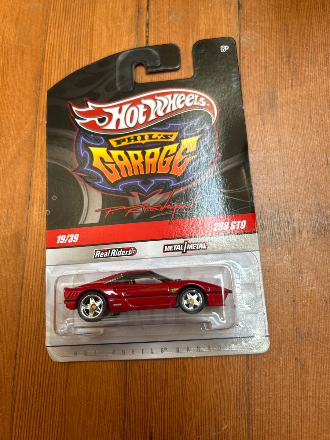 This is a red 288 GTO Hot Wheels car from Phil's Garage series. It features Real Riders wheels and Metal Metal construction. Perfect for collectors!