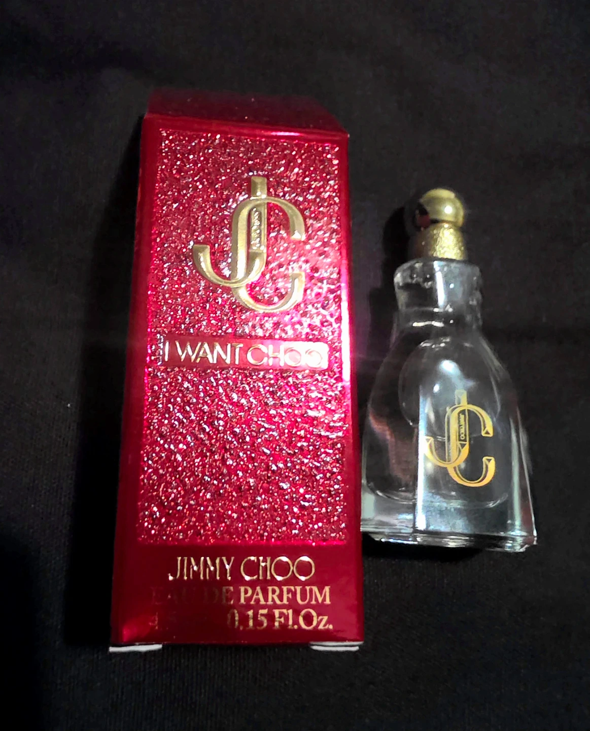 Brand New, Unopened Jimmy Choo I Want Choo Eau de Parfum miniature bottle. It's a 0.15 Fl.Oz. size. Comes with the original red glittery box.