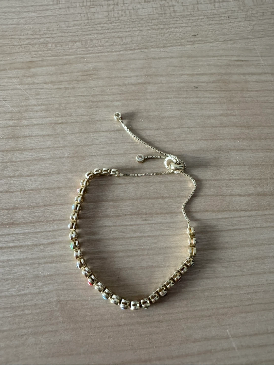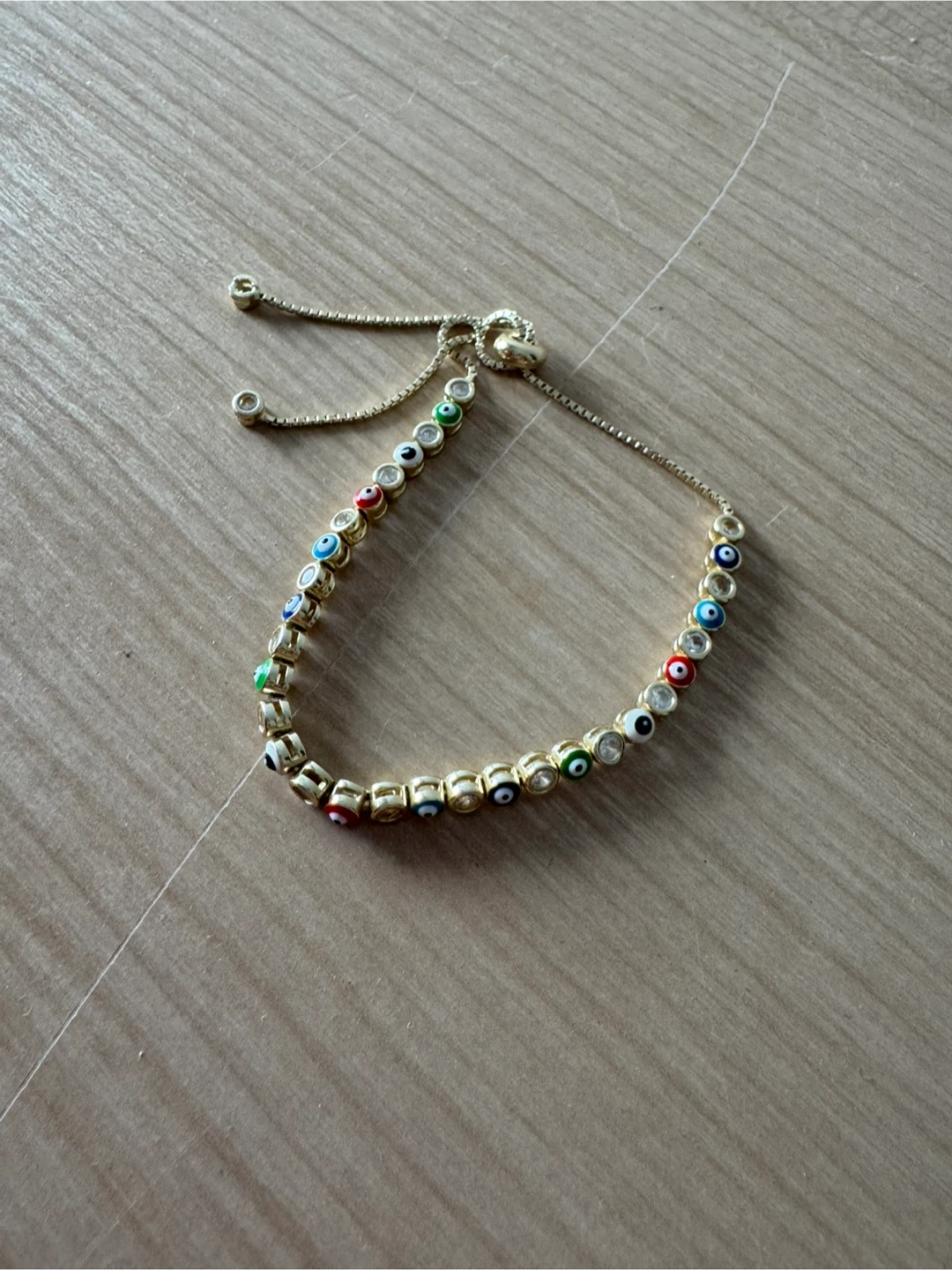 This is a gold-tone bracelet with an adjustable slider clasp. It features a repeating pattern of cubic zirconia stones interspersed with colorful evil eye charms. The evil eye charms have blue, red, white, green, and black details.