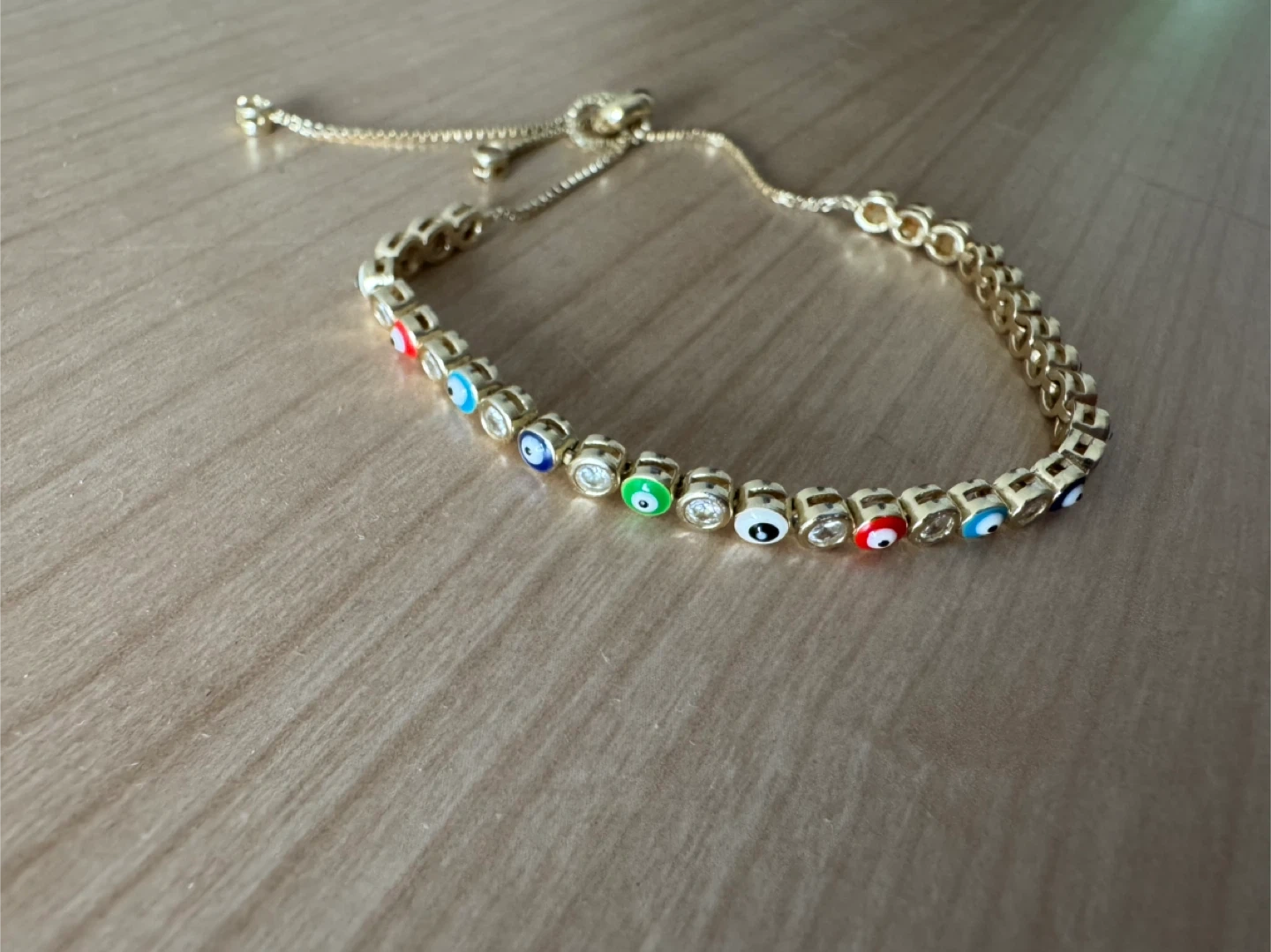This is a gold-tone bracelet with an adjustable slider clasp. It features a repeating pattern of cubic zirconia stones interspersed with colorful evil eye charms. The evil eye charms have blue, red, white, green, and black details.